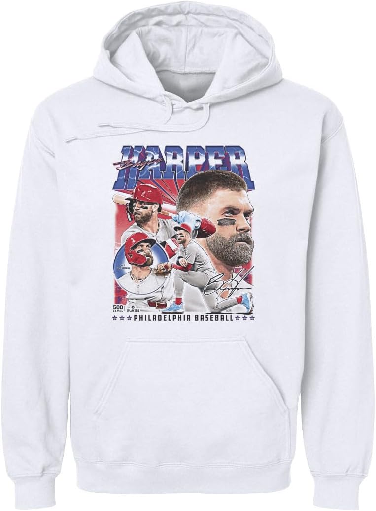 Elevate your fall gameday wardrobe with a 500 LEVEL Officially Licensed Bryce Harper Hoodie. Our Bryce Harper Hooded Sweatshirts are a game-changer for diehard Philadelphia fans. Featuring a bold Bryce Harper design printed on the front, this hoodie will be your go-to sweatshirt for every Philadelphia game.
