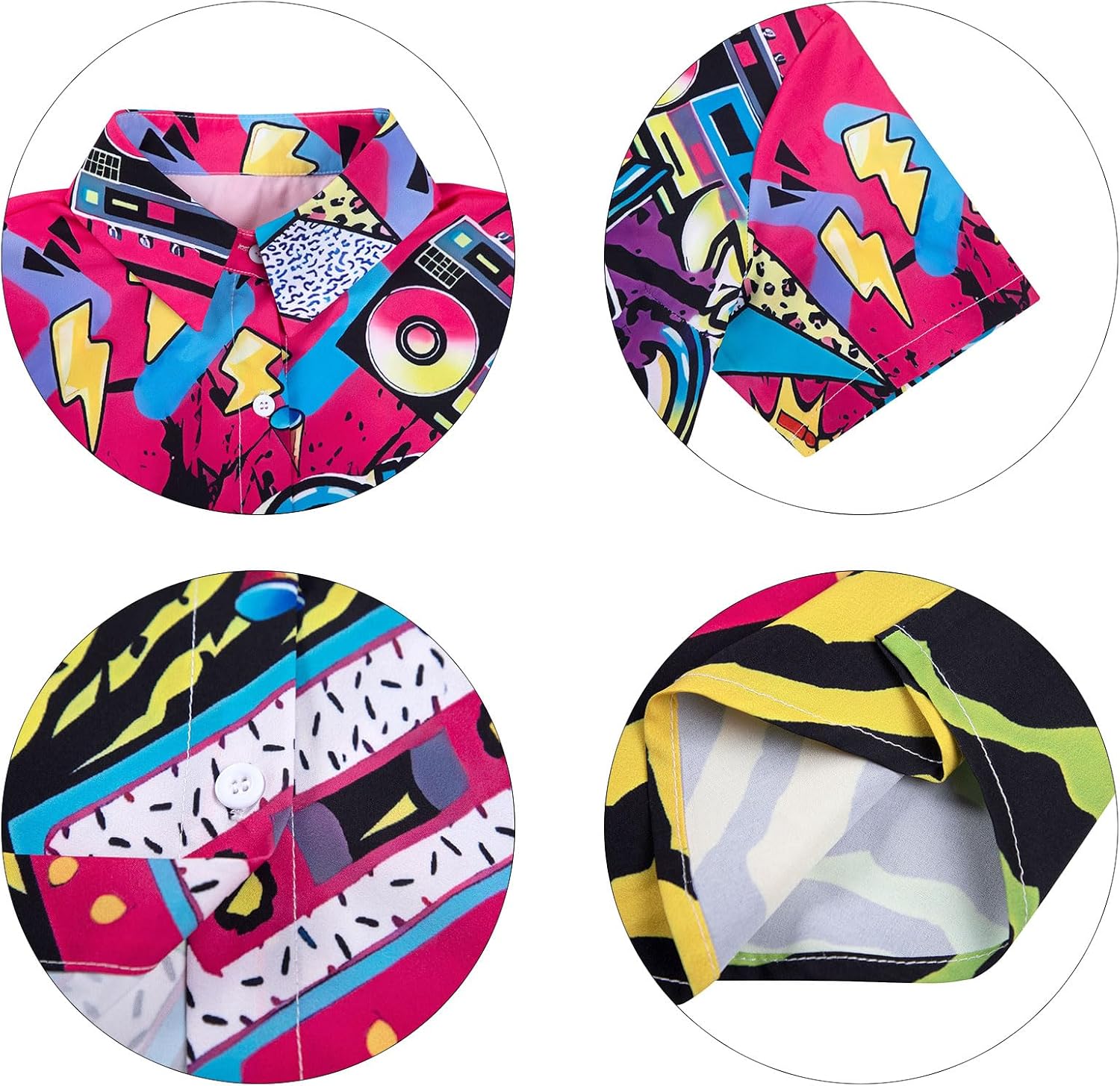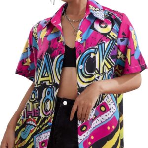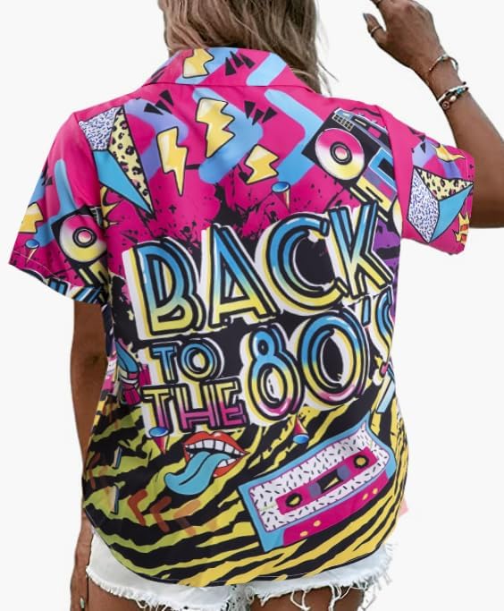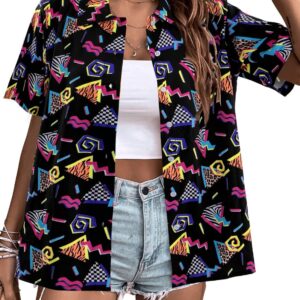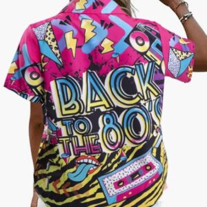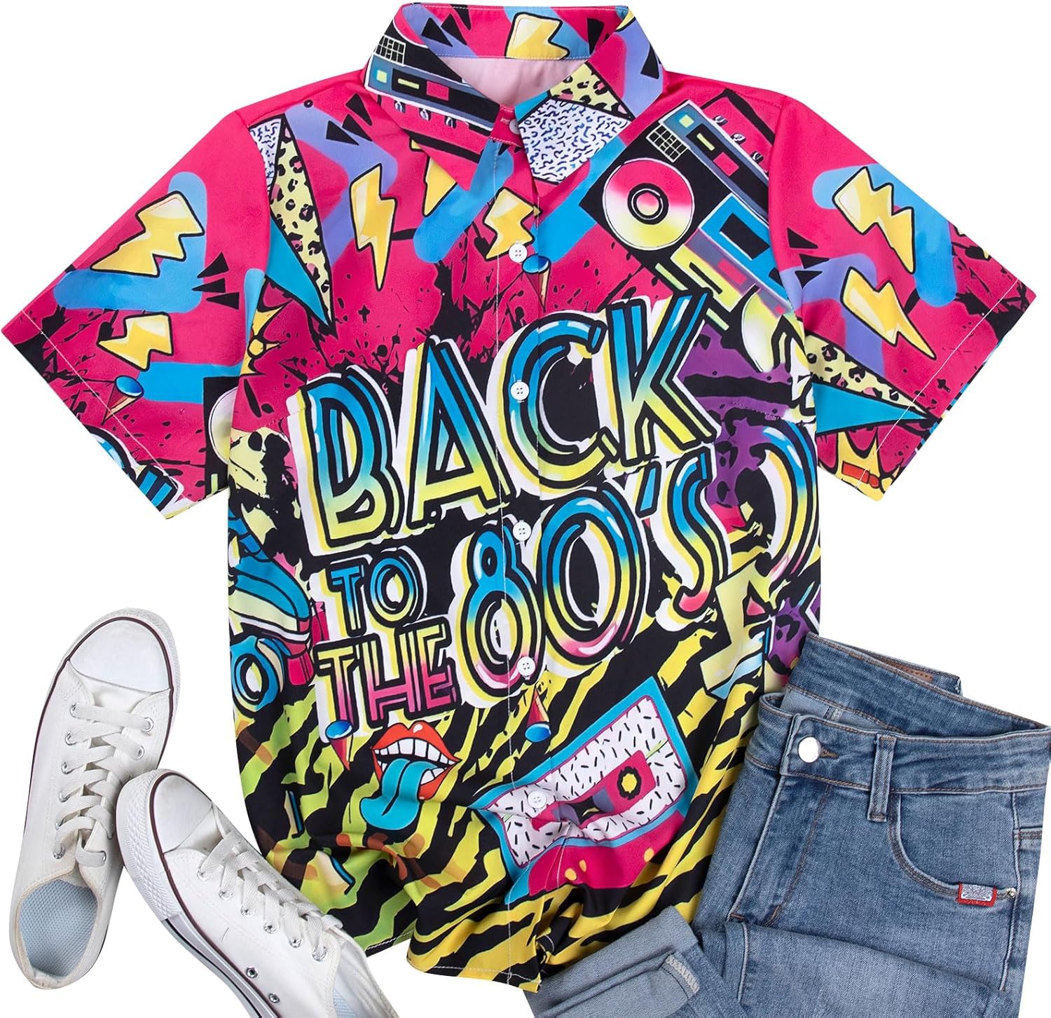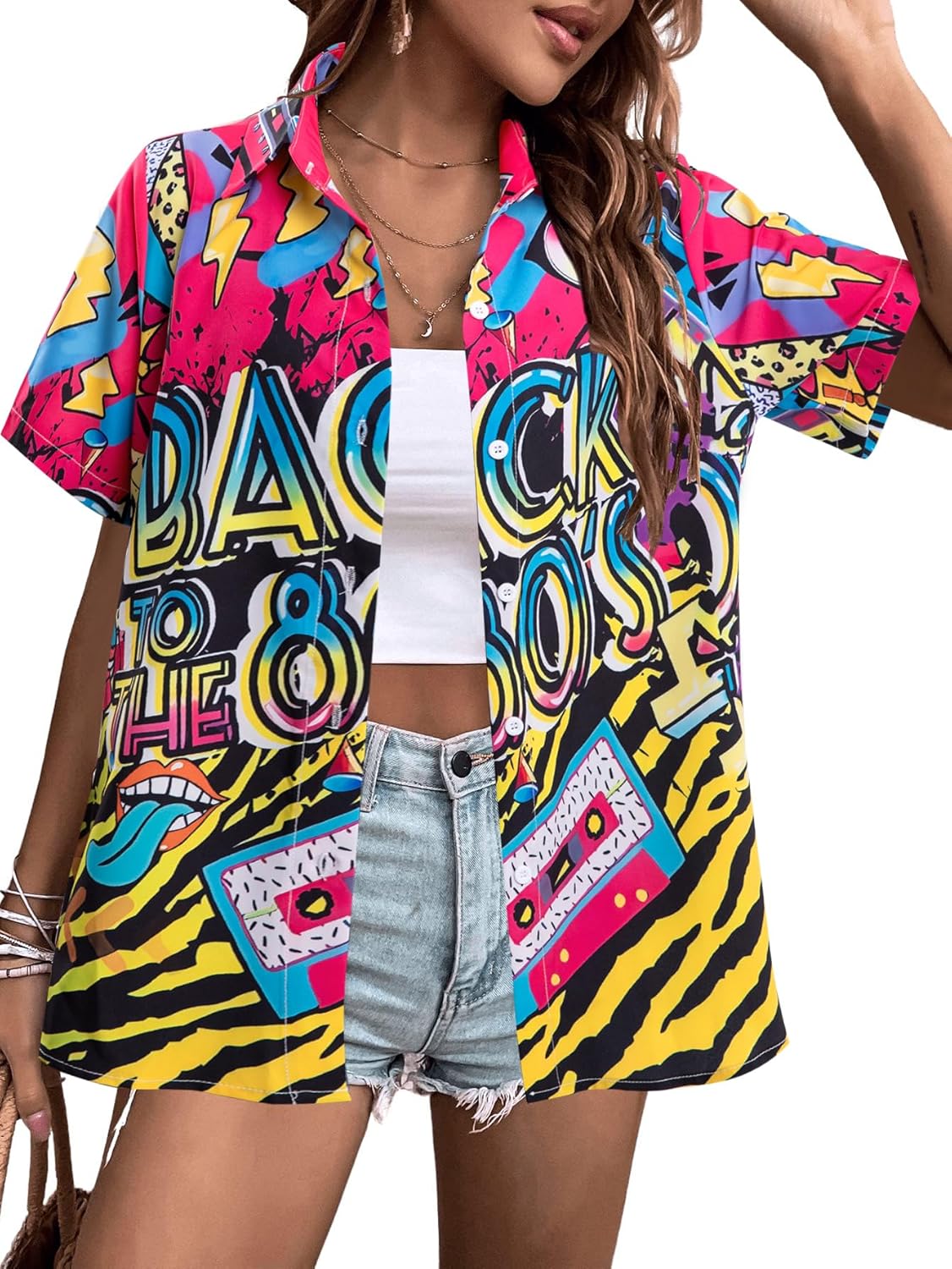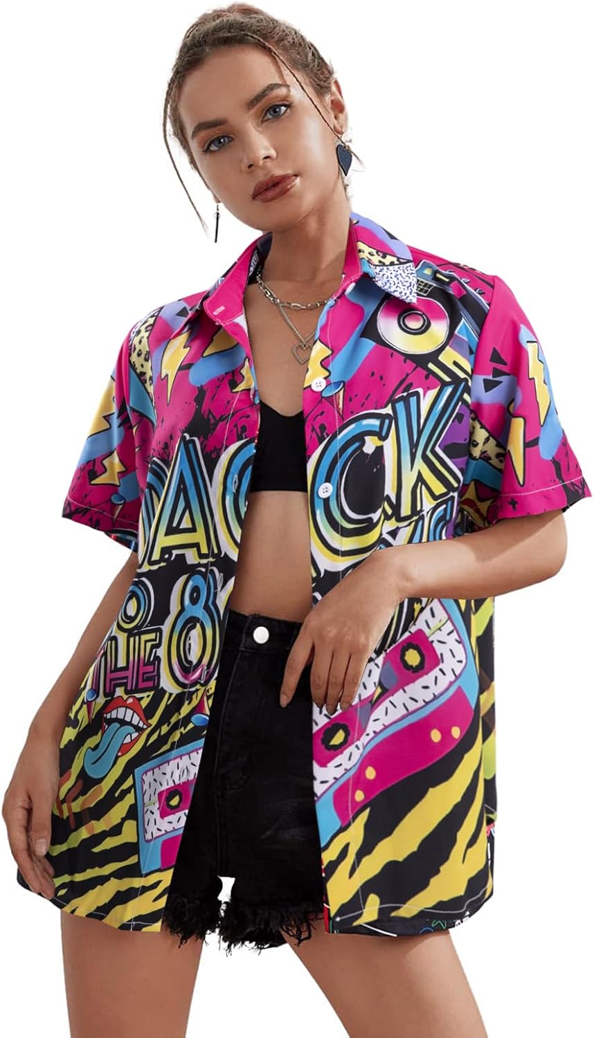 80s 90s Outfits for Women Retro Theme Party Disco Shirt 80s Hawaiian Shirt Neon Button Down Short Sleeve Blouse Tops