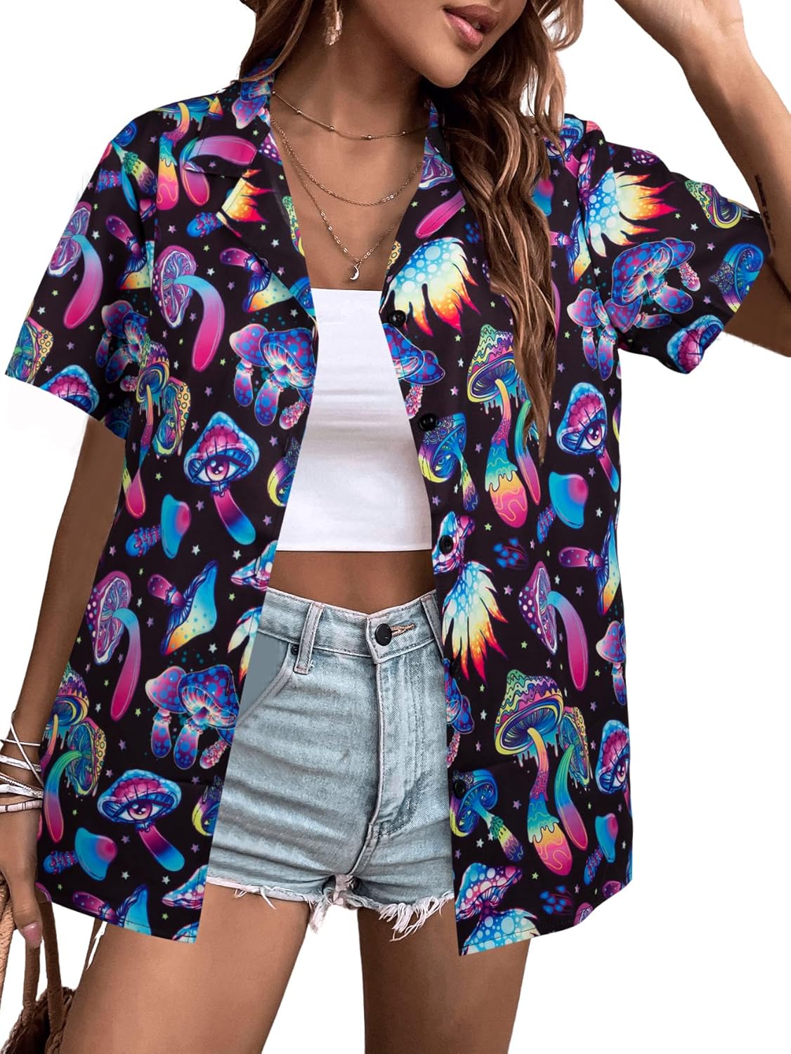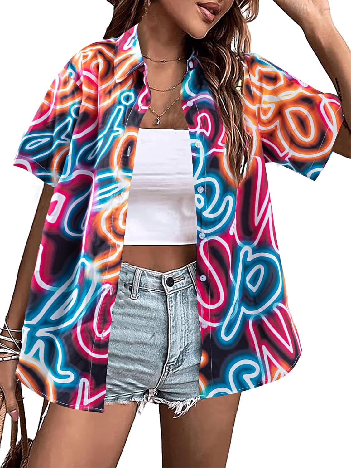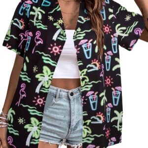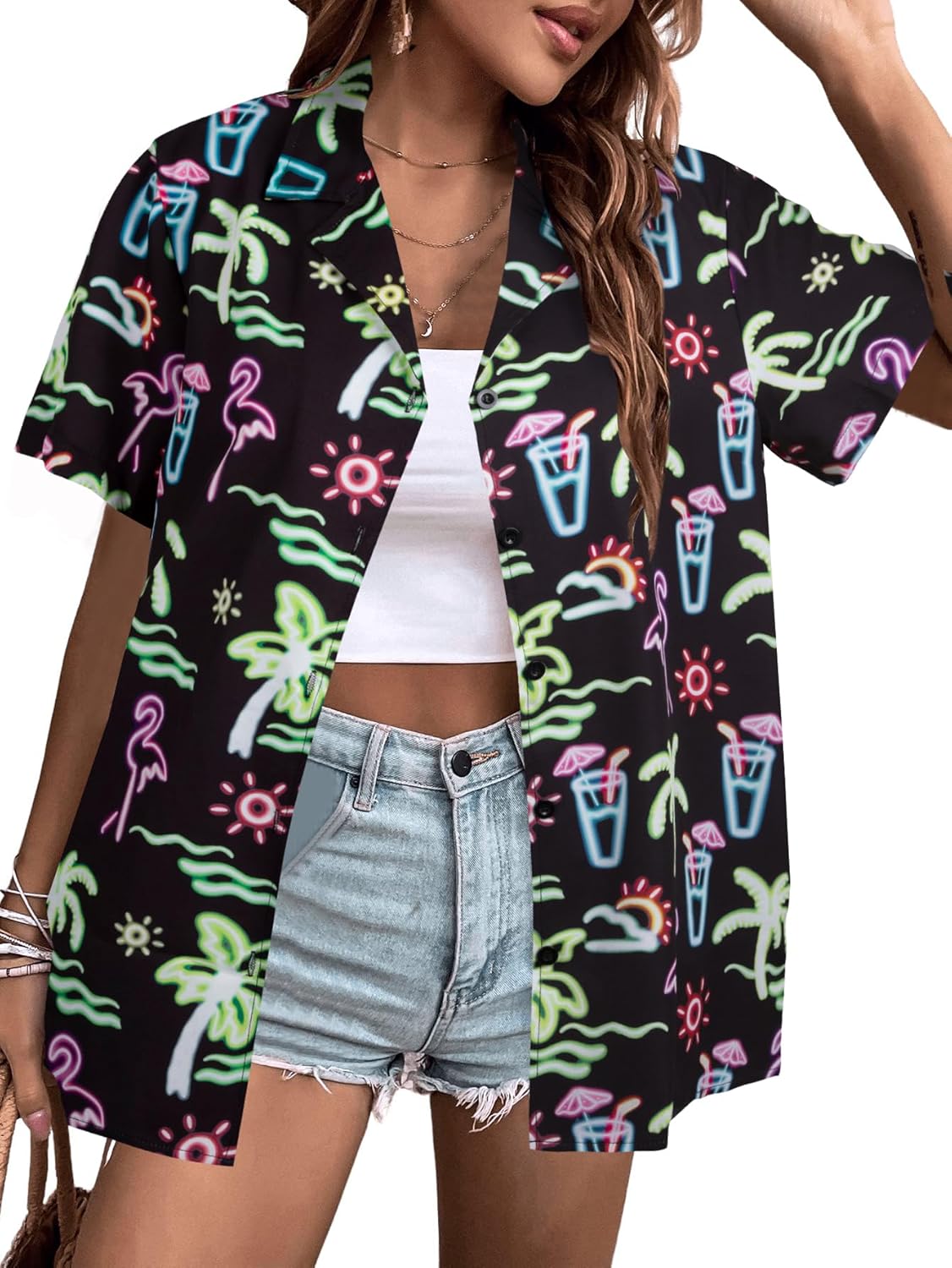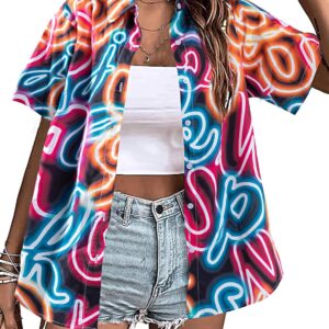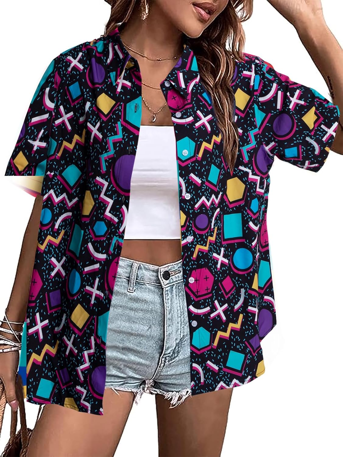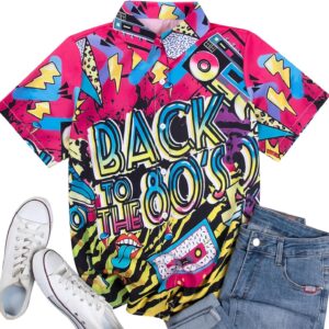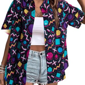 80s 90s Outfits for Women Retro Theme Party Disco Shirt 80s Hawaiian Shirt Neon Button Down Short Sleeve Blouse Tops