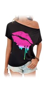Stay comfortable with GEROPHOR Lip Print T-Shirt, which features an off-shoulder style that The T-shirt offers a comfortable and breathable fabric that is perfect for everyday wear and is sure to make you stand out from the crowd. Whether you're looking to dress up for a special occasion or just want to elevate your casual wardrobe, this head-turning shirt is sure to impress. 80s outfit for women trendy design makes it a versatile piece that you can effortlessly style in countless ways.