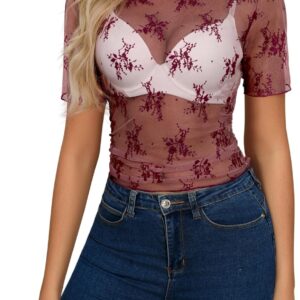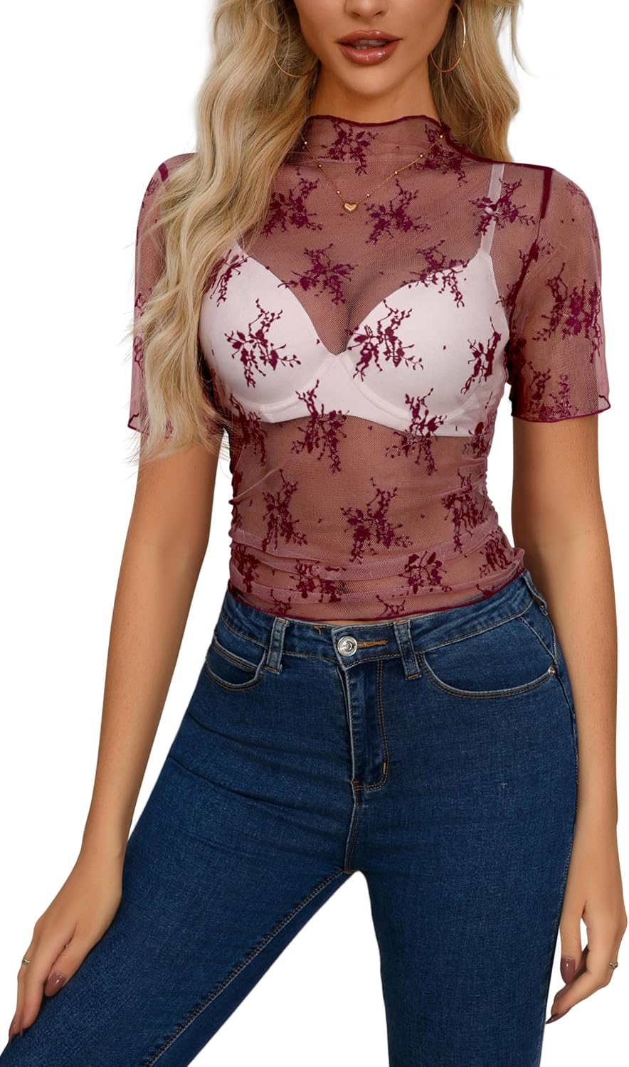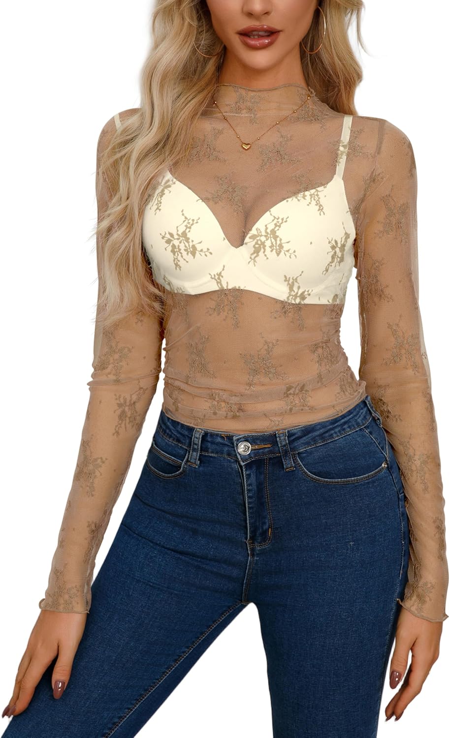 AISEW Womens Mesh Sheer Long Sleeve Crop Tops Mock Neck Sexy See Through Tee Shirts Lace Floral Y2K Layering Top Blouses