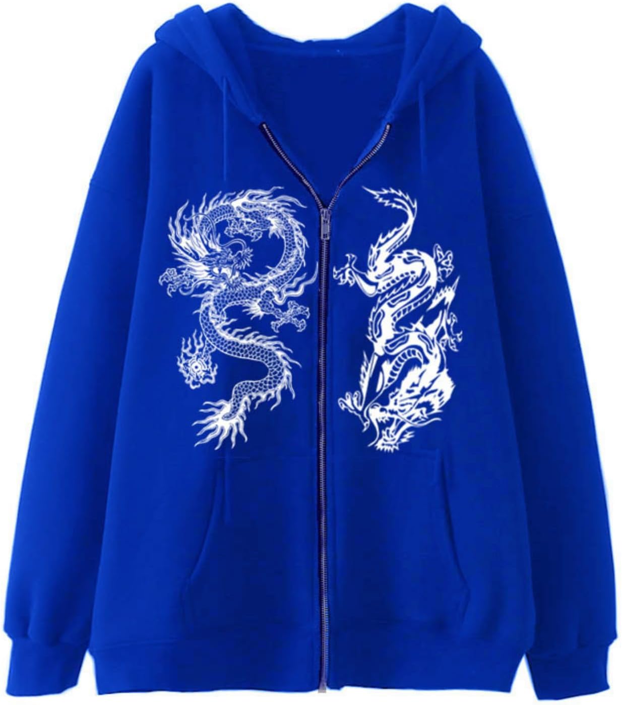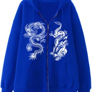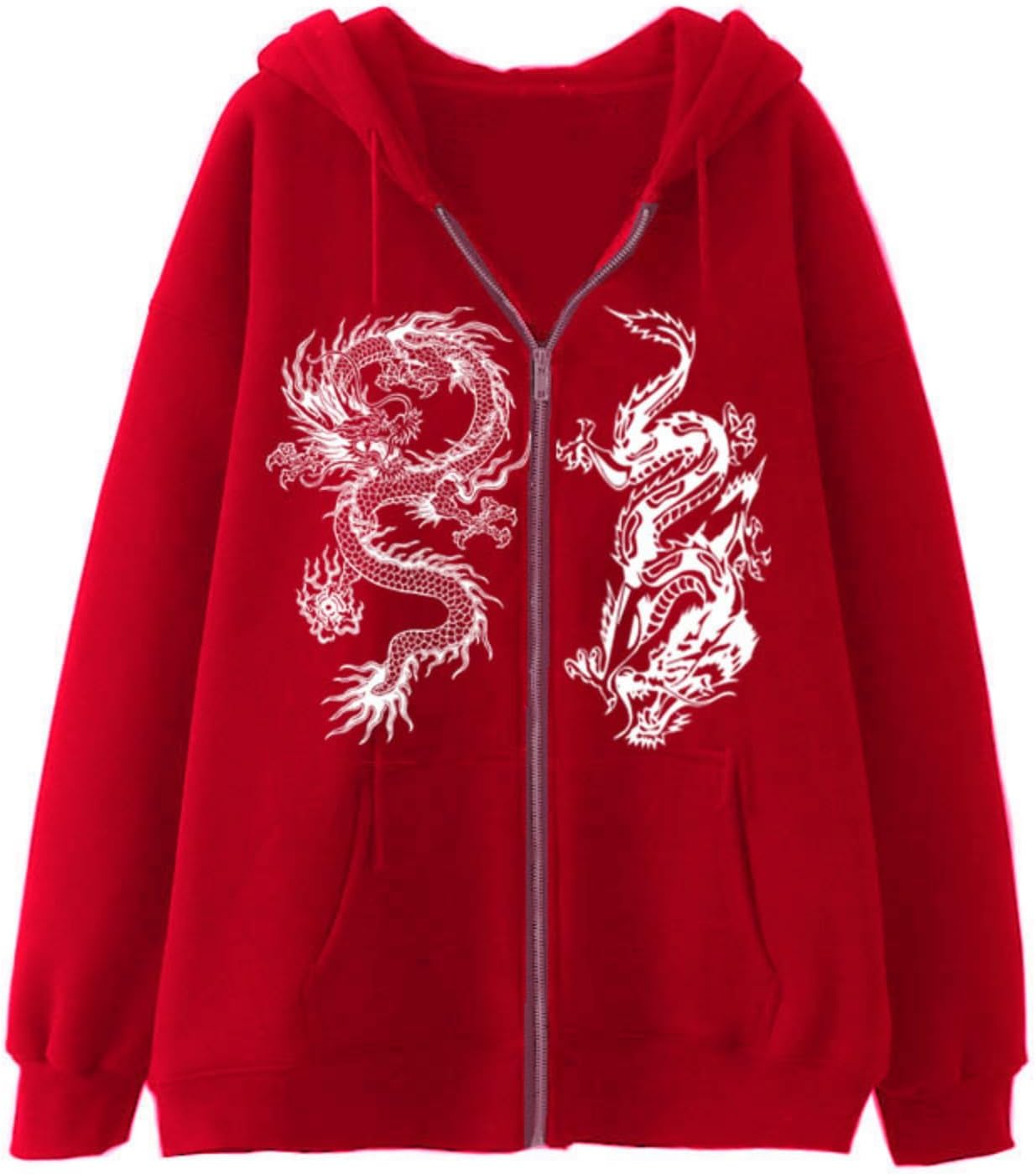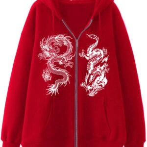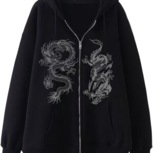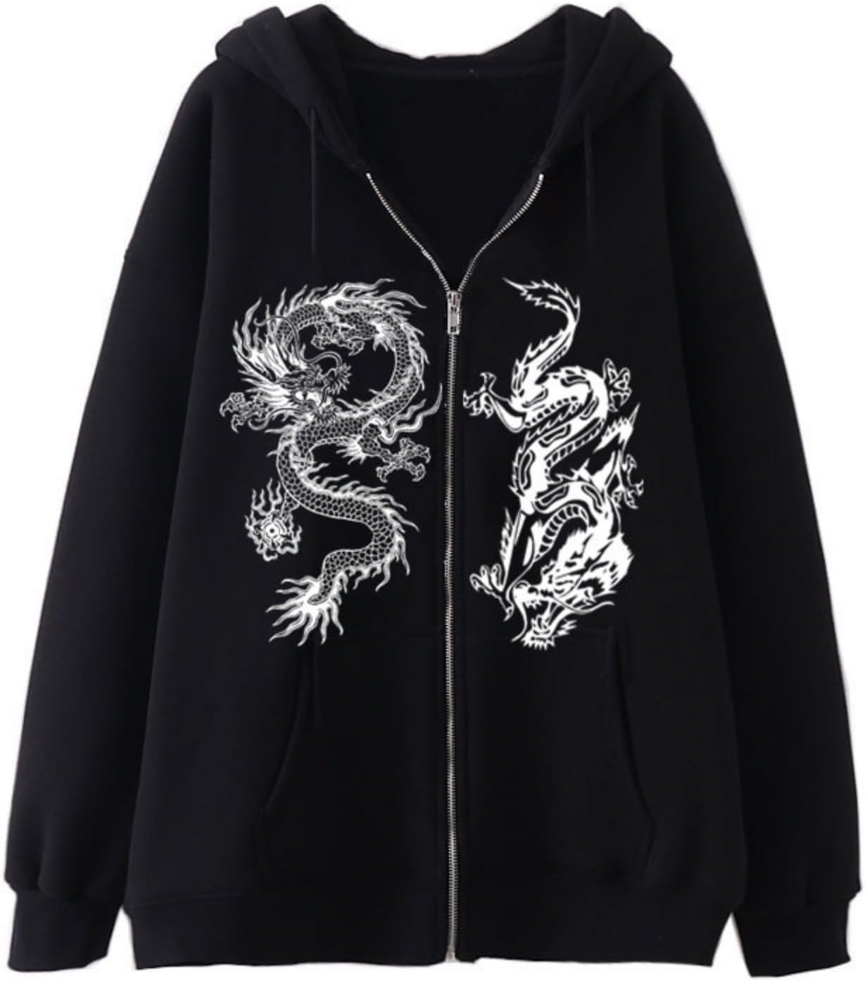 Aobiono Women Men Y2K Zip Up Oversized Hoodie Gothic Dragon Graphic Emo Grunge Alt Baggy Fleece Jacket 90s Punk Streetwear