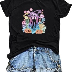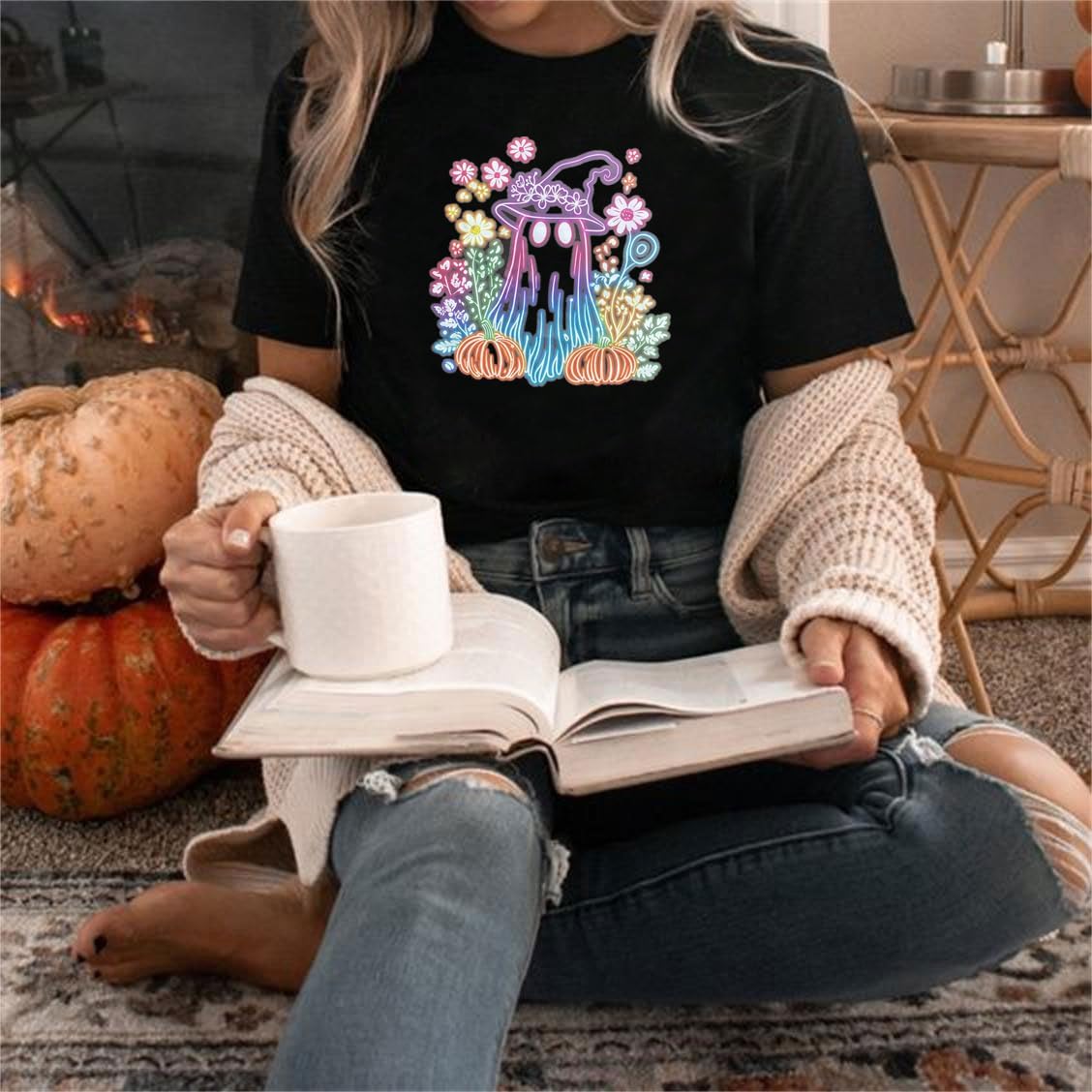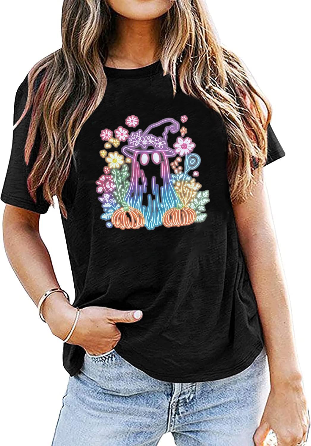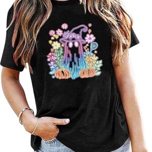 Halloween Neon Ghost Tshirt Women Halloween Spooky Ghost Shirt Short Sleeve Funny Letter Print Tee Fall Holiday Tops