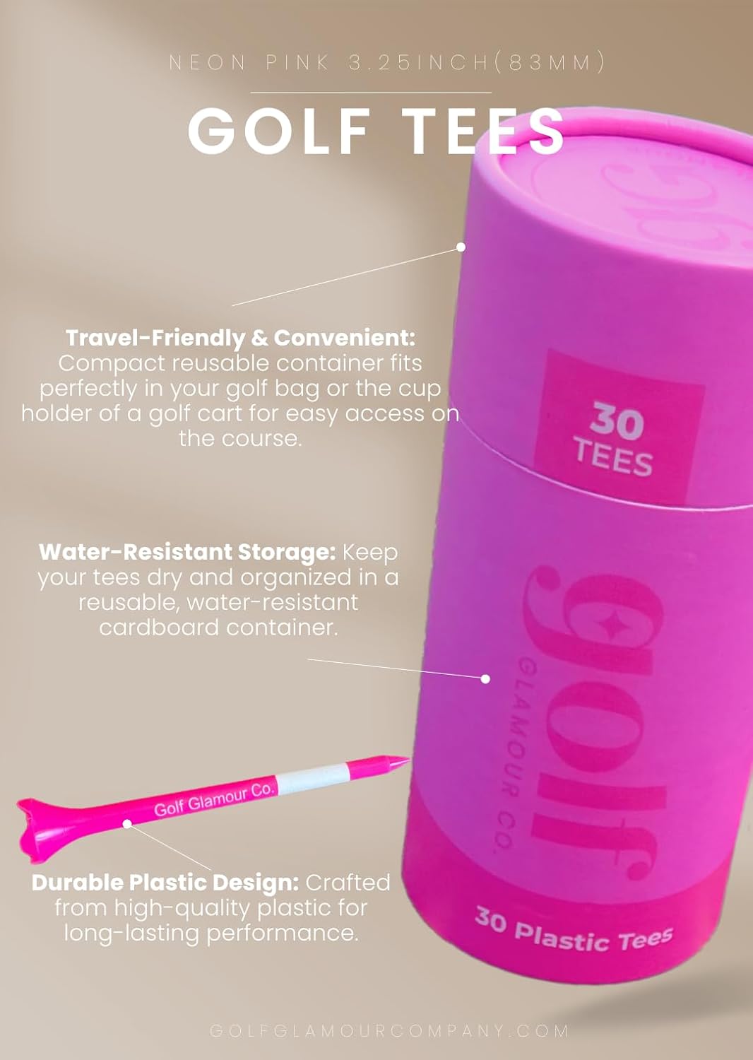 Hot Neon Pink Golf Tees 3.25 Inch (83mm) - High-Visibility Lady Golf Tee Set (Pack of 30) for Maximum Woman Performance, Women's Driving, Long Shots, Aesthetic, Gift, Breast Cancer Awareness