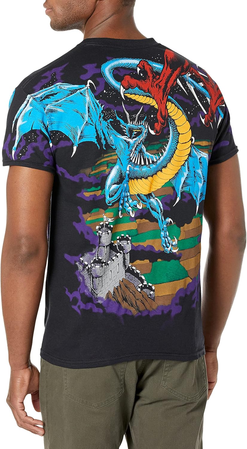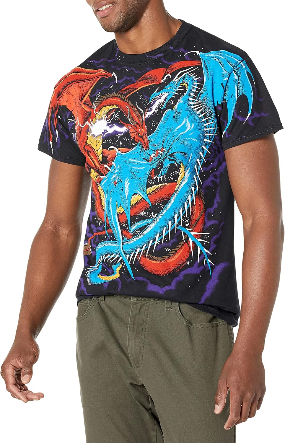 Two mythical dragons battle on both sides of this beautiful graphic tee brought to you by Liquid Blue. Artistically rendered and screen printed with pride in the USA. 100% cotton.