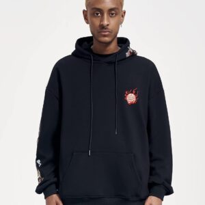 Hoodie front sports fire logo patchwork, simple yet profound. Inspired by ancient Chinese walls, flames signify dragon's rule over society from above.