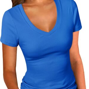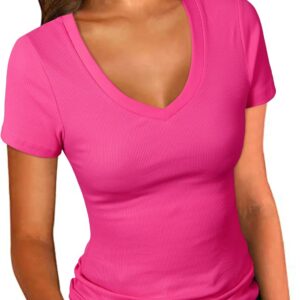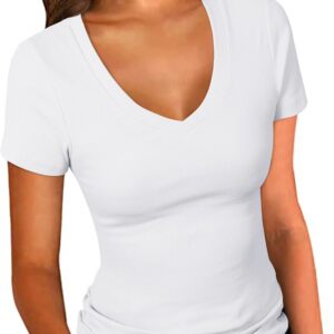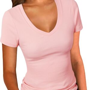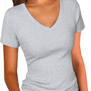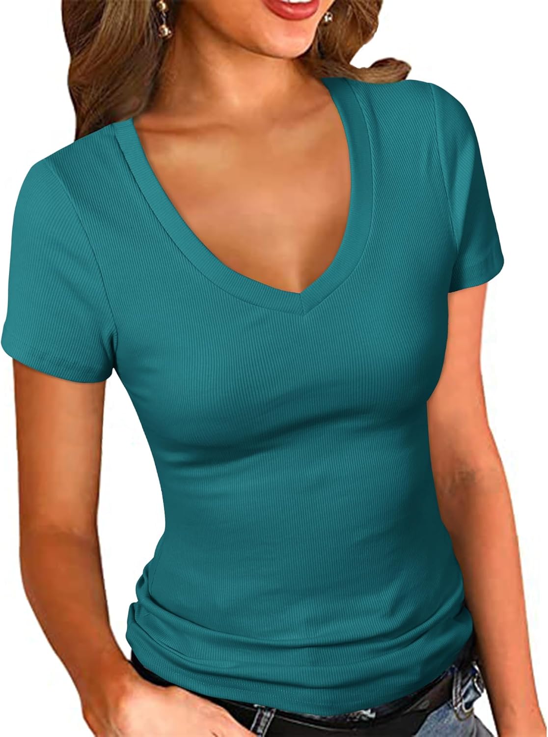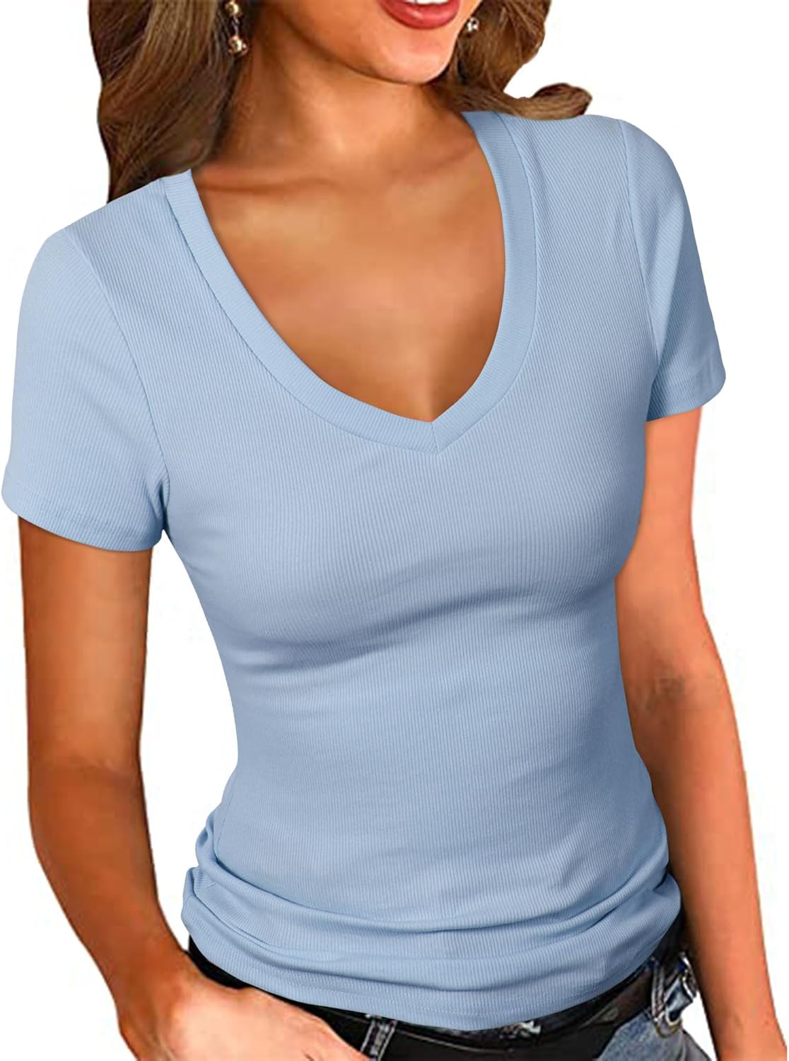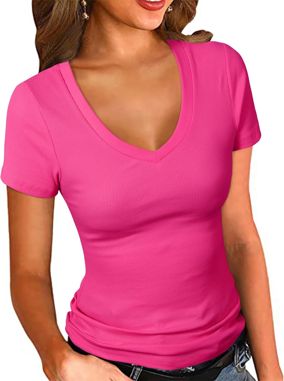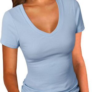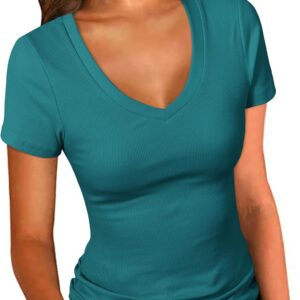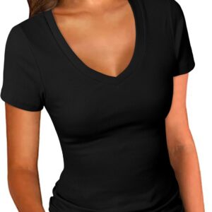 - Feature: Short Sleeves, V neck, Form Fitted, Bodycon Slim Fit, Solid Color, Ribbed Plain tee shirt tops, No Shrink.