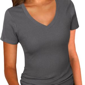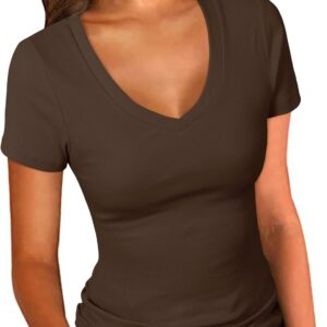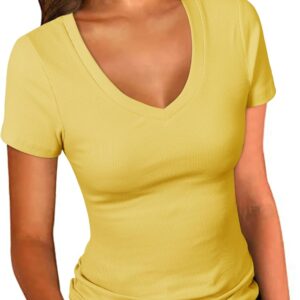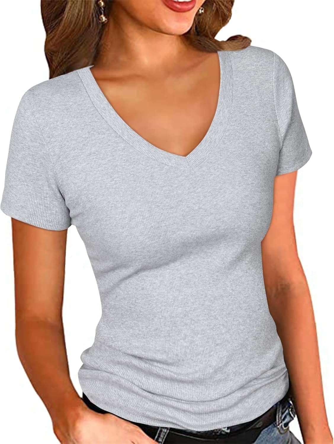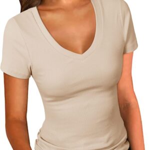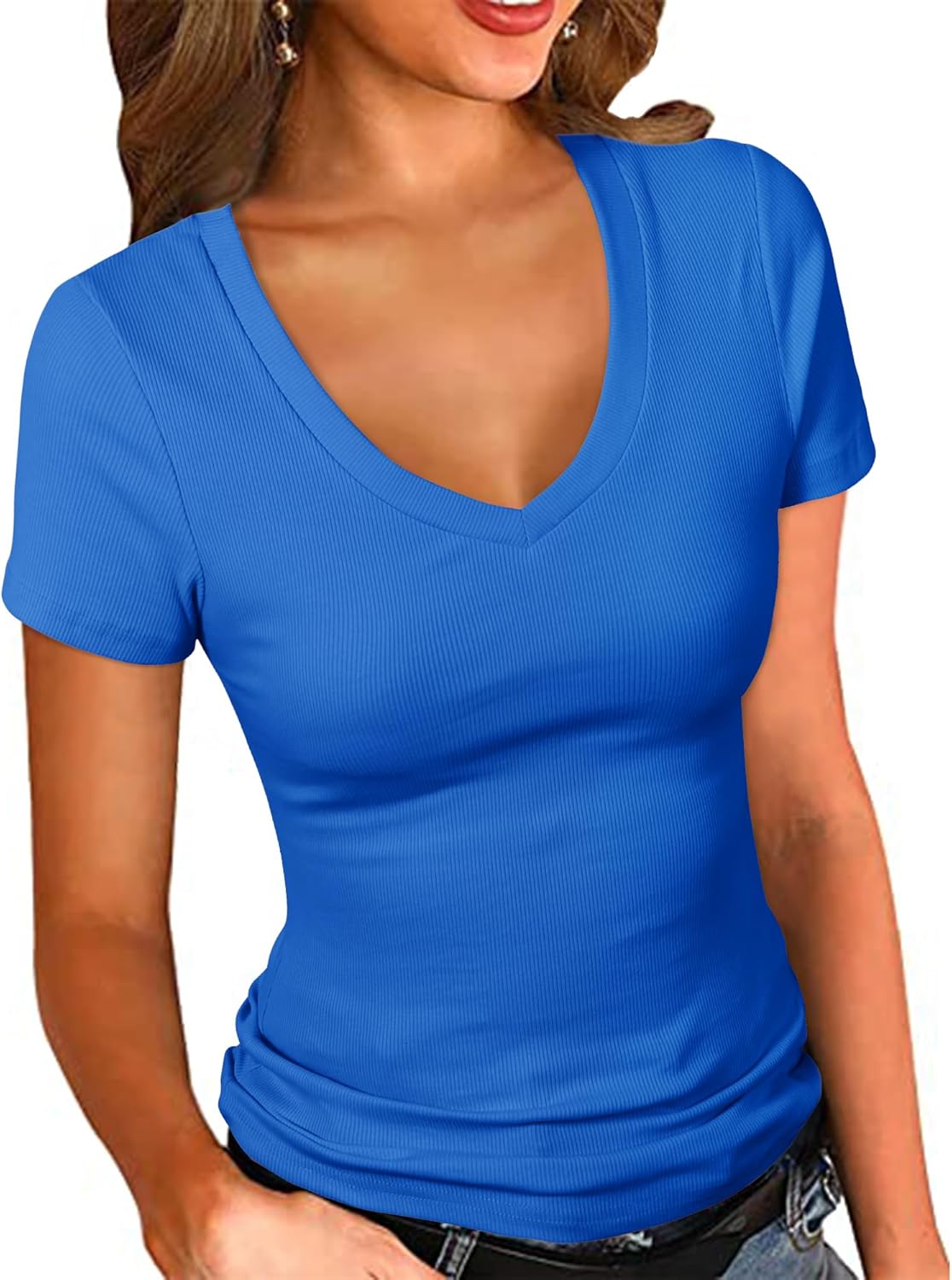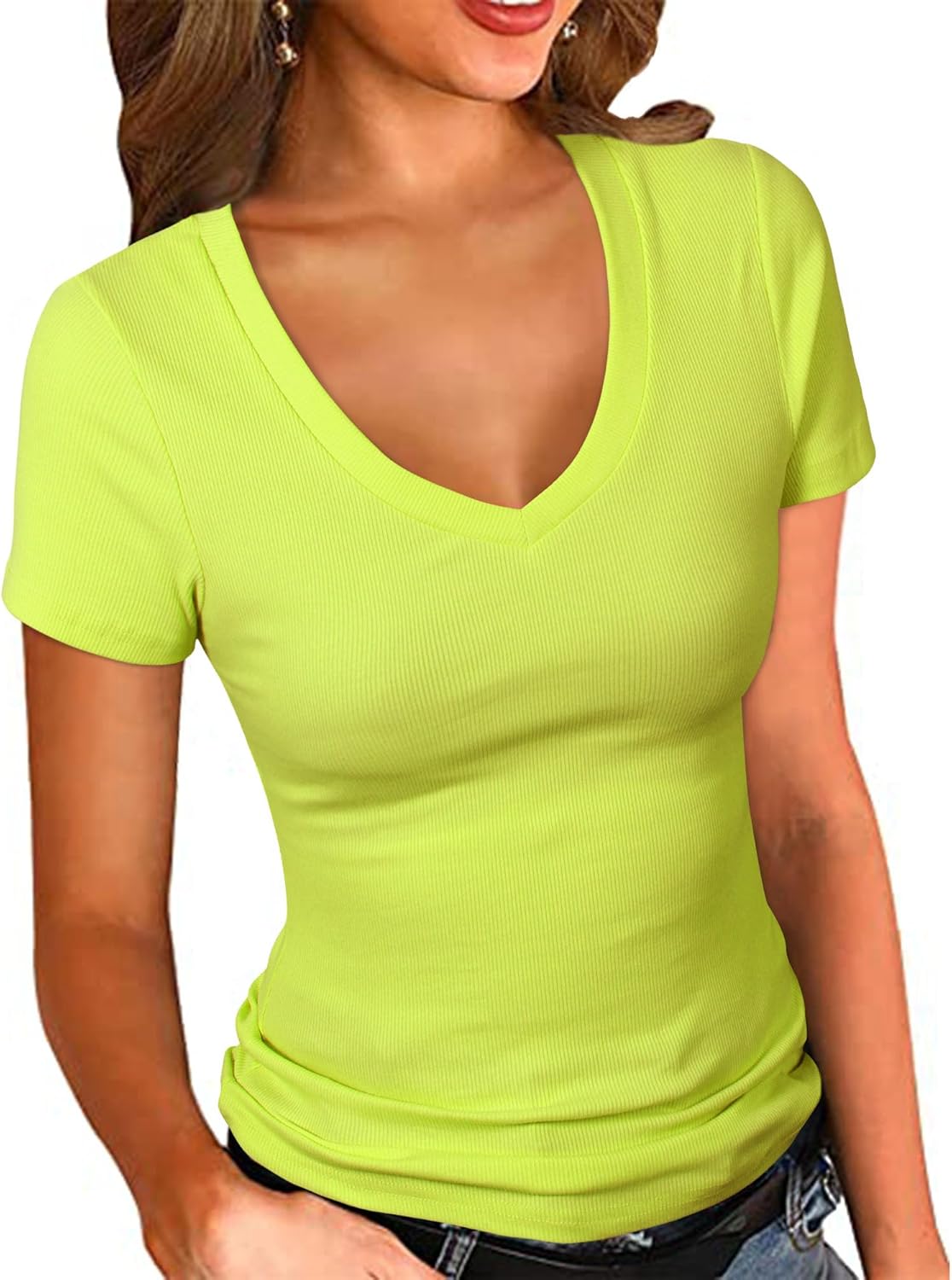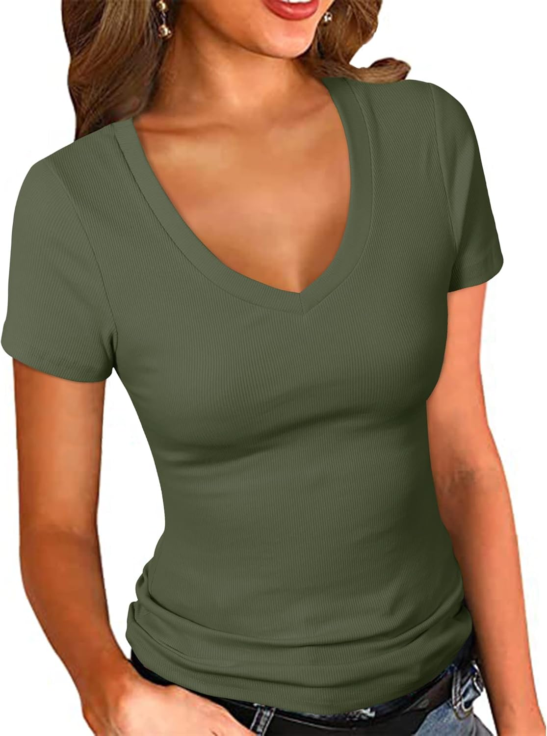 - Feature: Short Sleeves, V neck, Form Fitted, Bodycon Slim Fit, Solid Color, Ribbed Plain tee shirt tops, No Shrink.