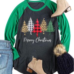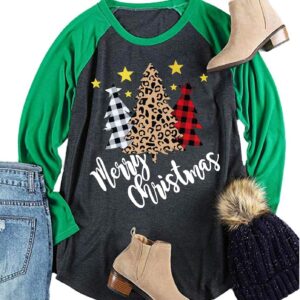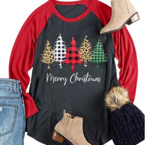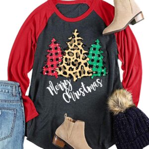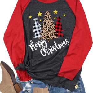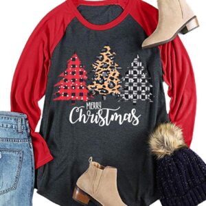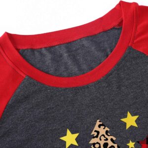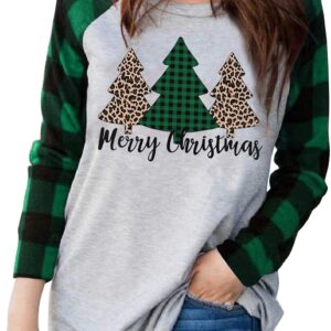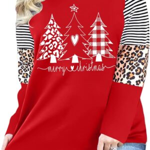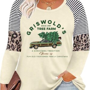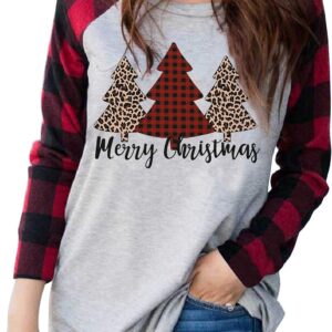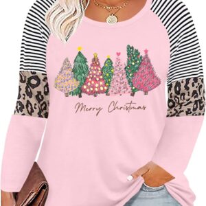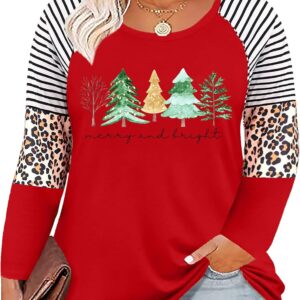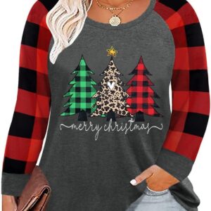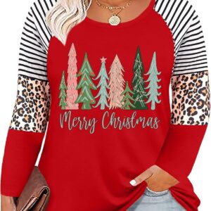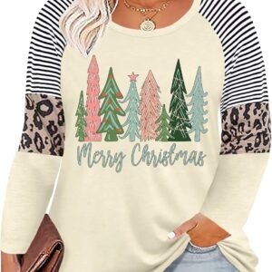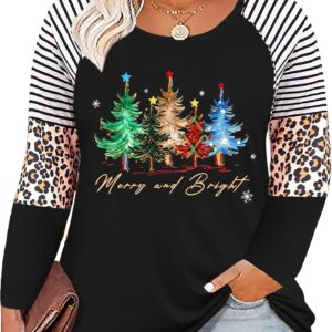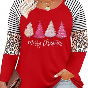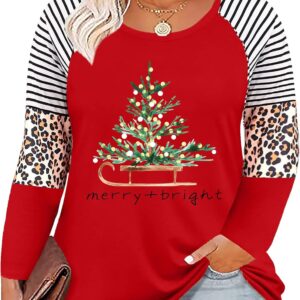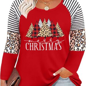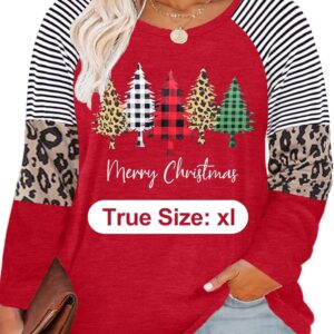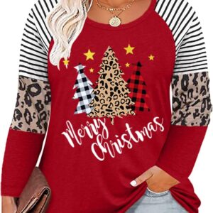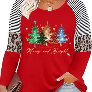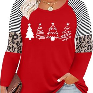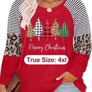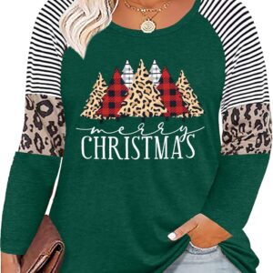 Plus Size Christmas T Shirt Women Xmas Leopard Plaid Trees Print Tees Casual Long Sleeve Holiday Shirts Top