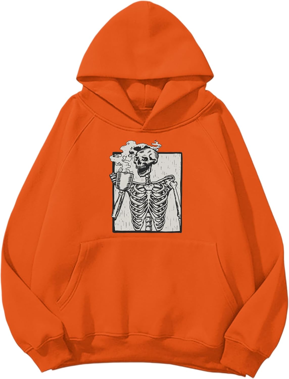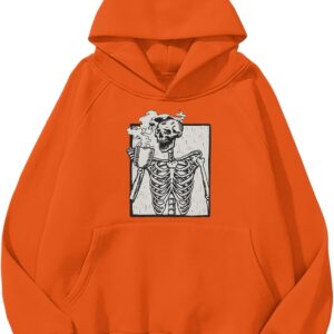 The skeleton pullover hoodie is made of cotton blend thermal fleece lining. Super soft, comfortable, keep you warm in spring, fall and winter. Black loose fit hoodie, khaki skull printed sweatshirt, retro brown sweatshirt pullover, dark grey casual pullover outwear, orange pumpkin halloween hoodie.