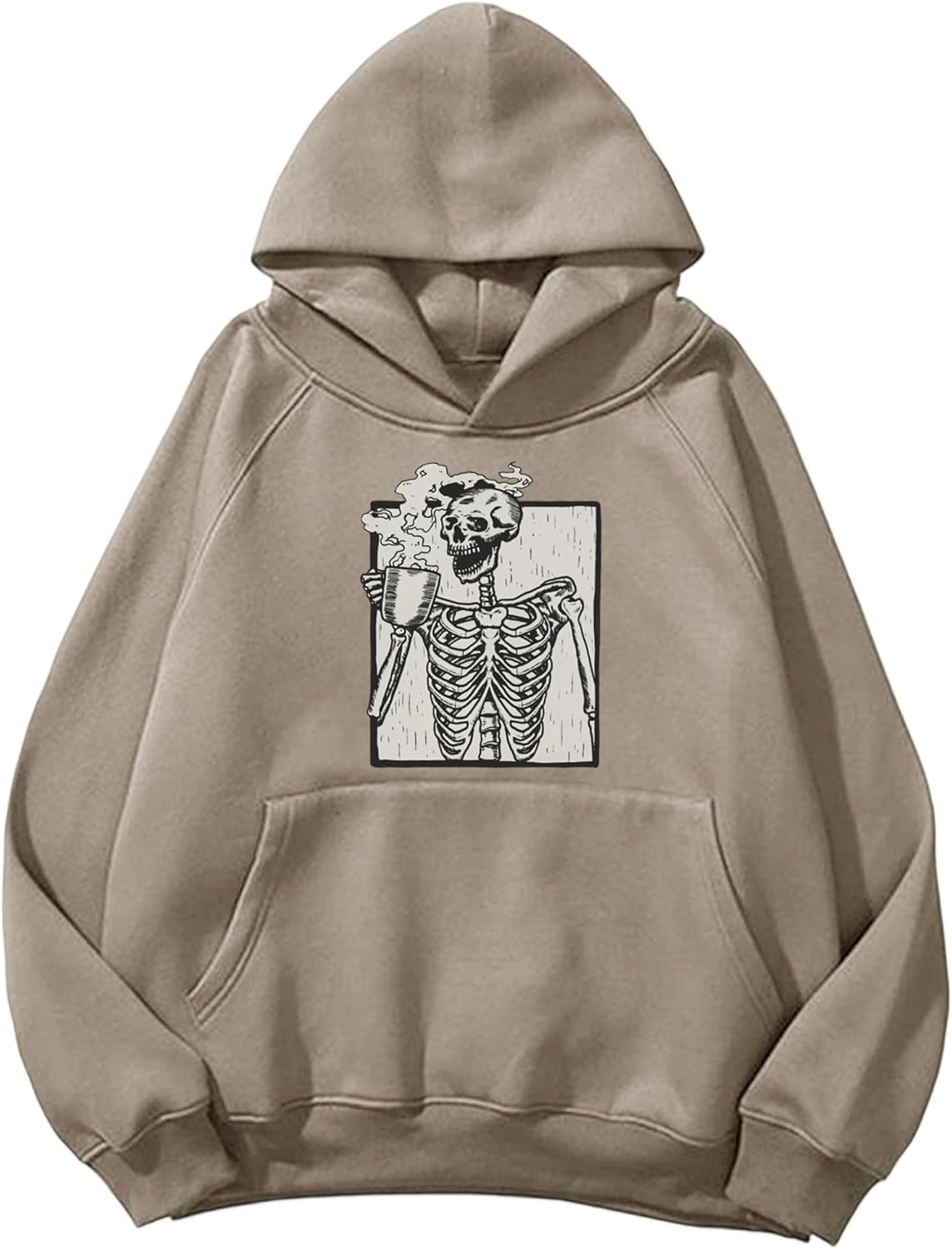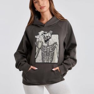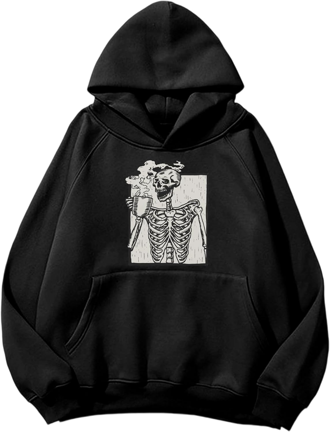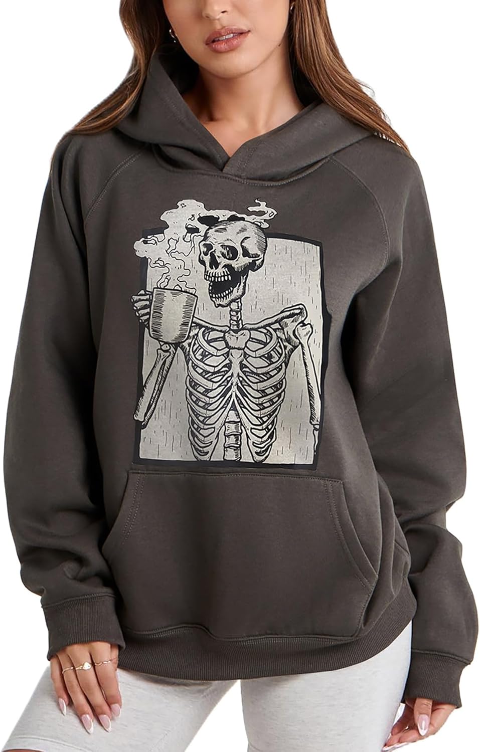 Goth punk grunge rave clothes for women, featuring retro and fun skull drinking coffee graphic printing, round neck, drop shoulder, long sleeve, ribbed cuffs, warm fleece inner, kangaroo pocket, loose fit boyfriend style. Skeleton oversized hoodie for women.