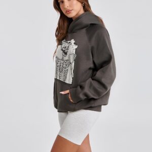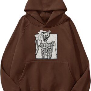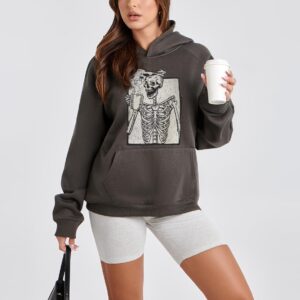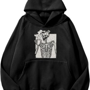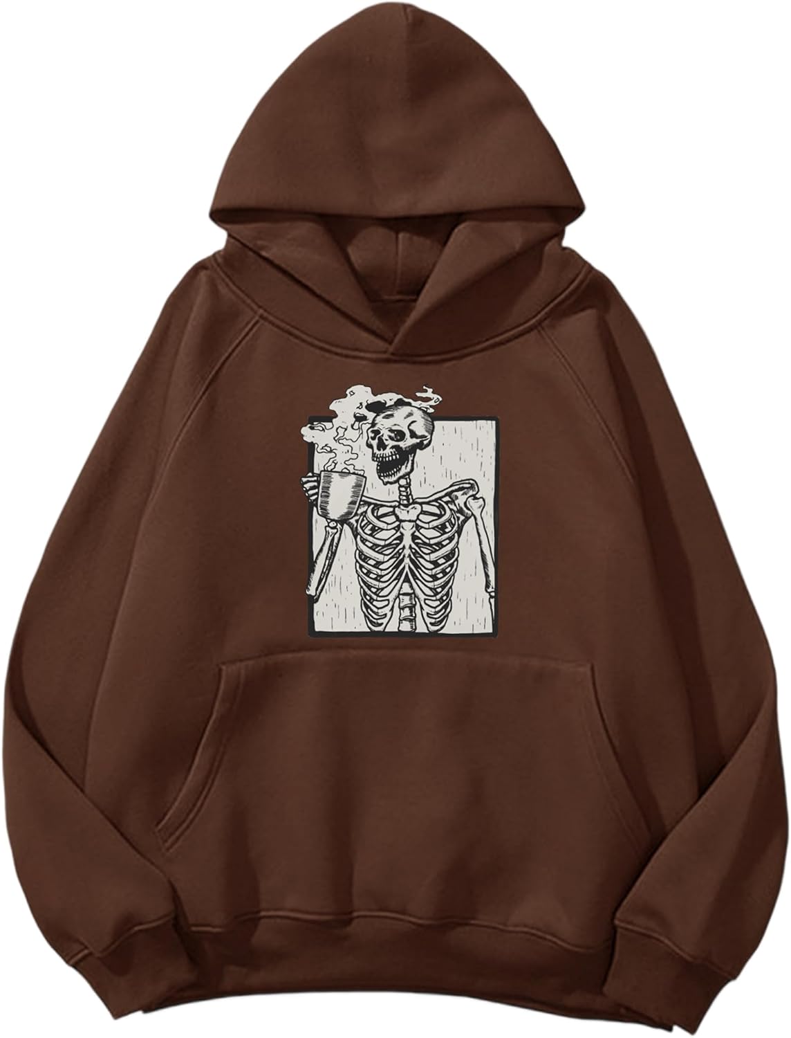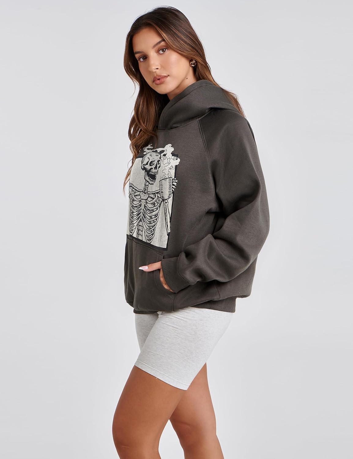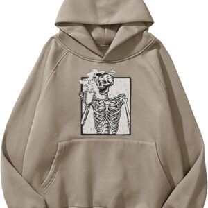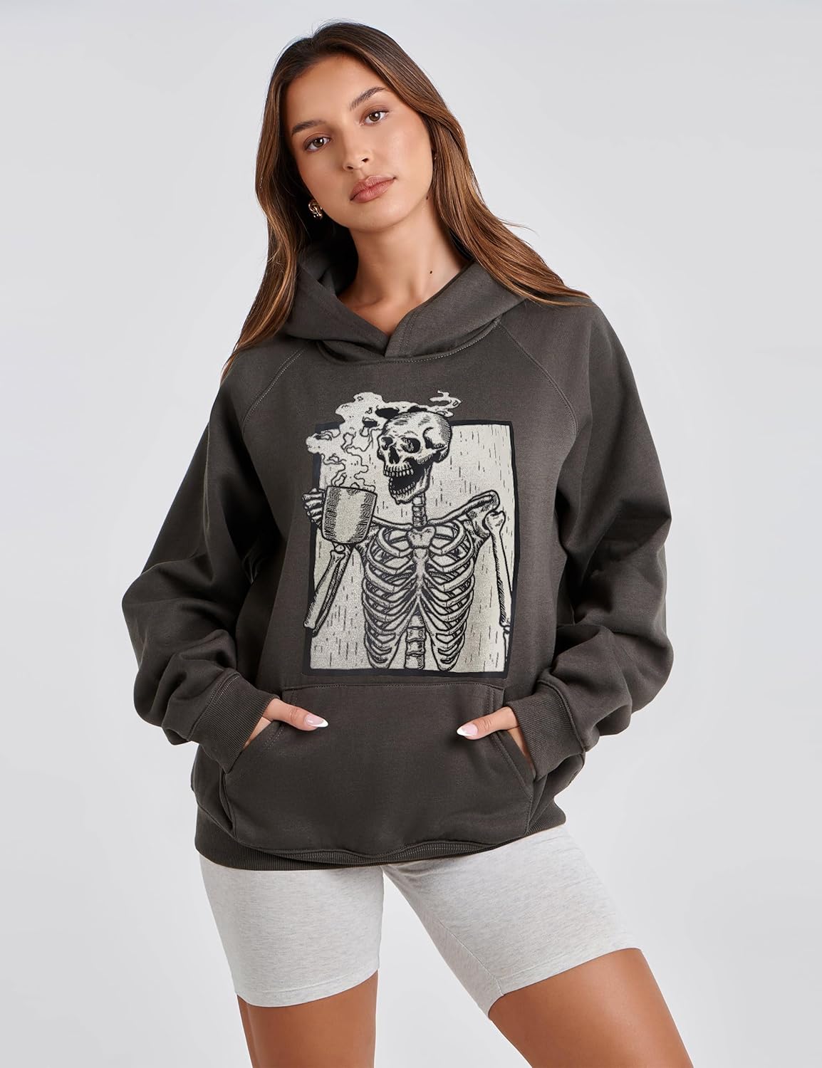 Goth punk grunge rave clothes for women, featuring retro and fun skull drinking coffee graphic printing, round neck, drop shoulder, long sleeve, ribbed cuffs, warm fleece inner, kangaroo pocket, loose fit boyfriend style. Skeleton oversized hoodie for women.