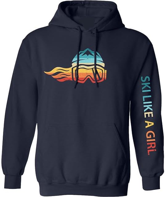 Turn up the heat on the mountain or off in our retro-inspired Ski Like A Girl women’s hoodie, The 1983. With bold sunset stripes and a vintage distressed look, this cozy navy blue layer is pure 1980s ski energy perfect for après-ski or chilly everyday adventures.