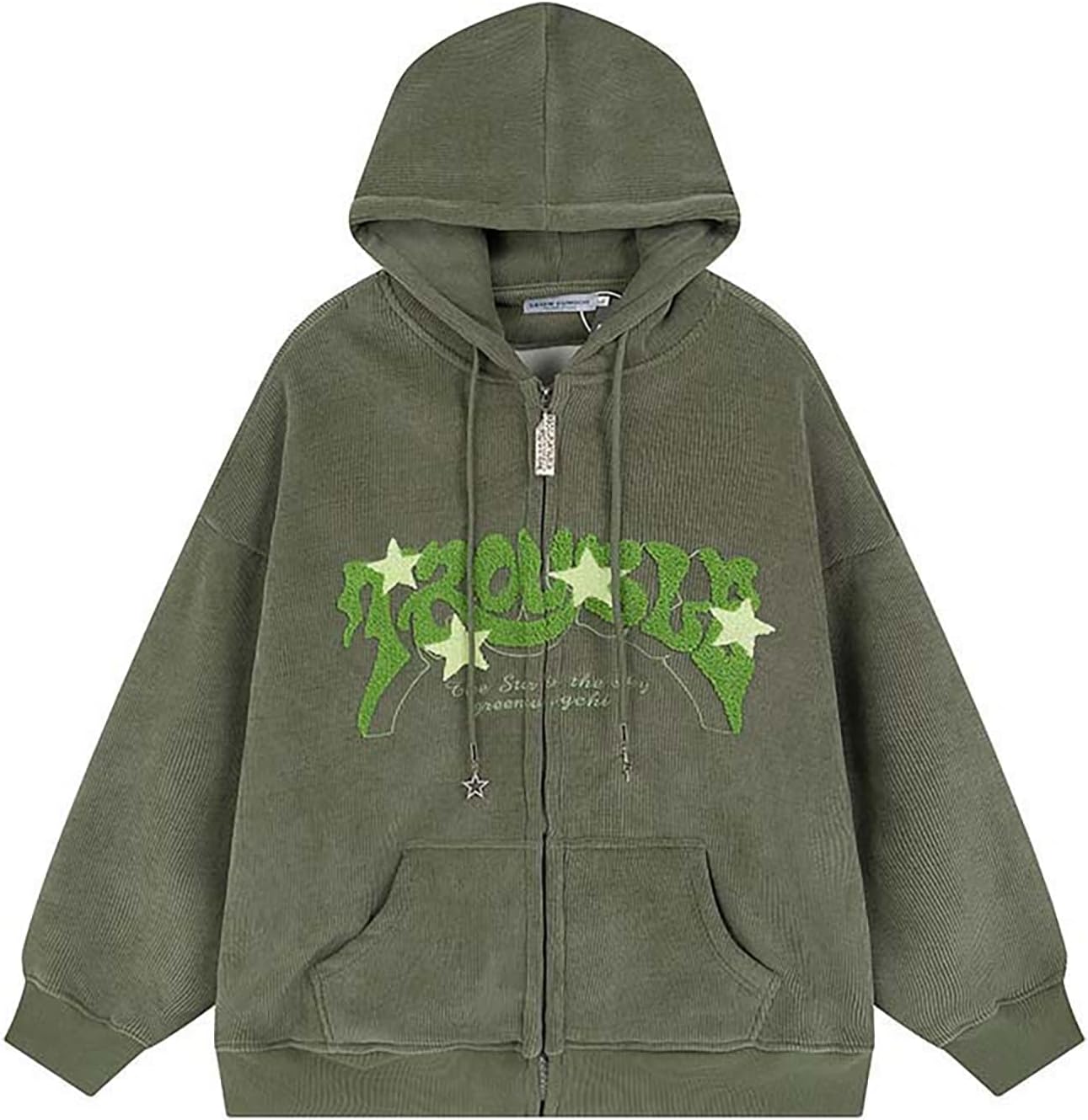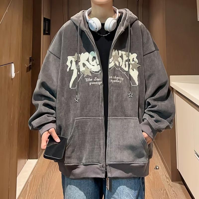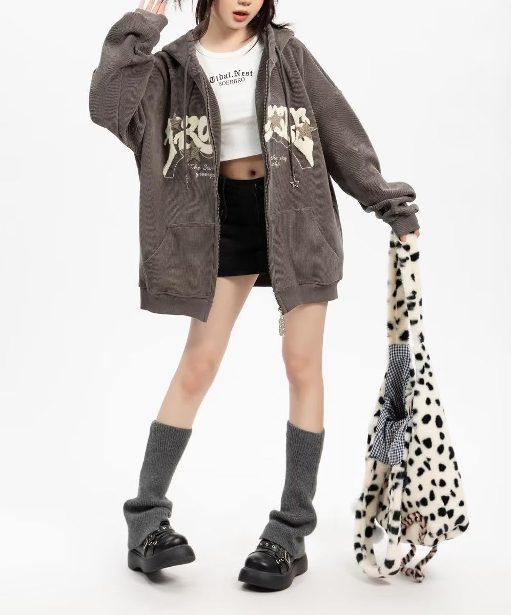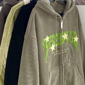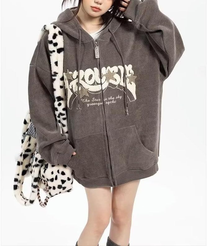 Sumleno Y2K Zip Up Hoodie Letter Print Star Graphic Grunge Hooded Corduroy Sweatshirt Jacket Oversized Retro Y2k Clothing