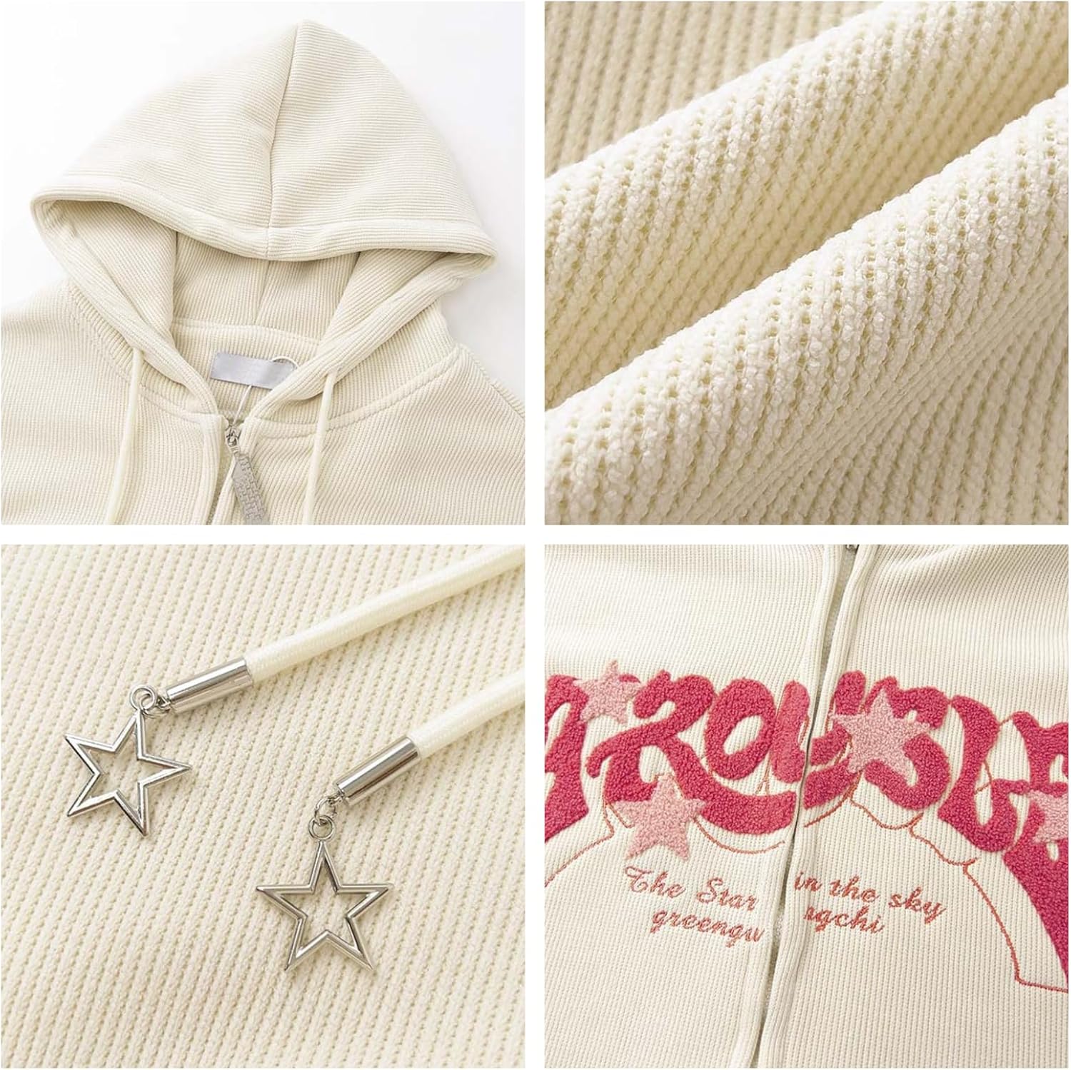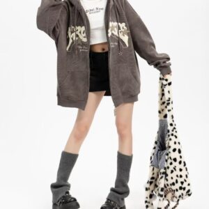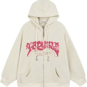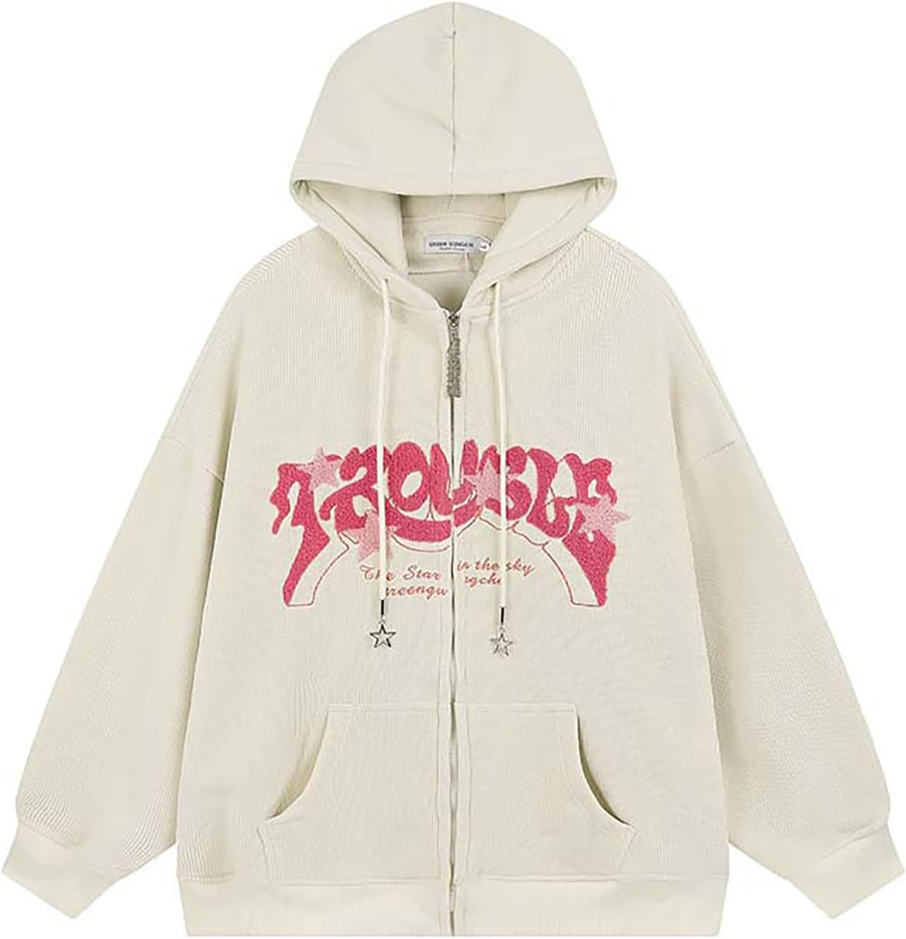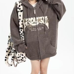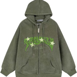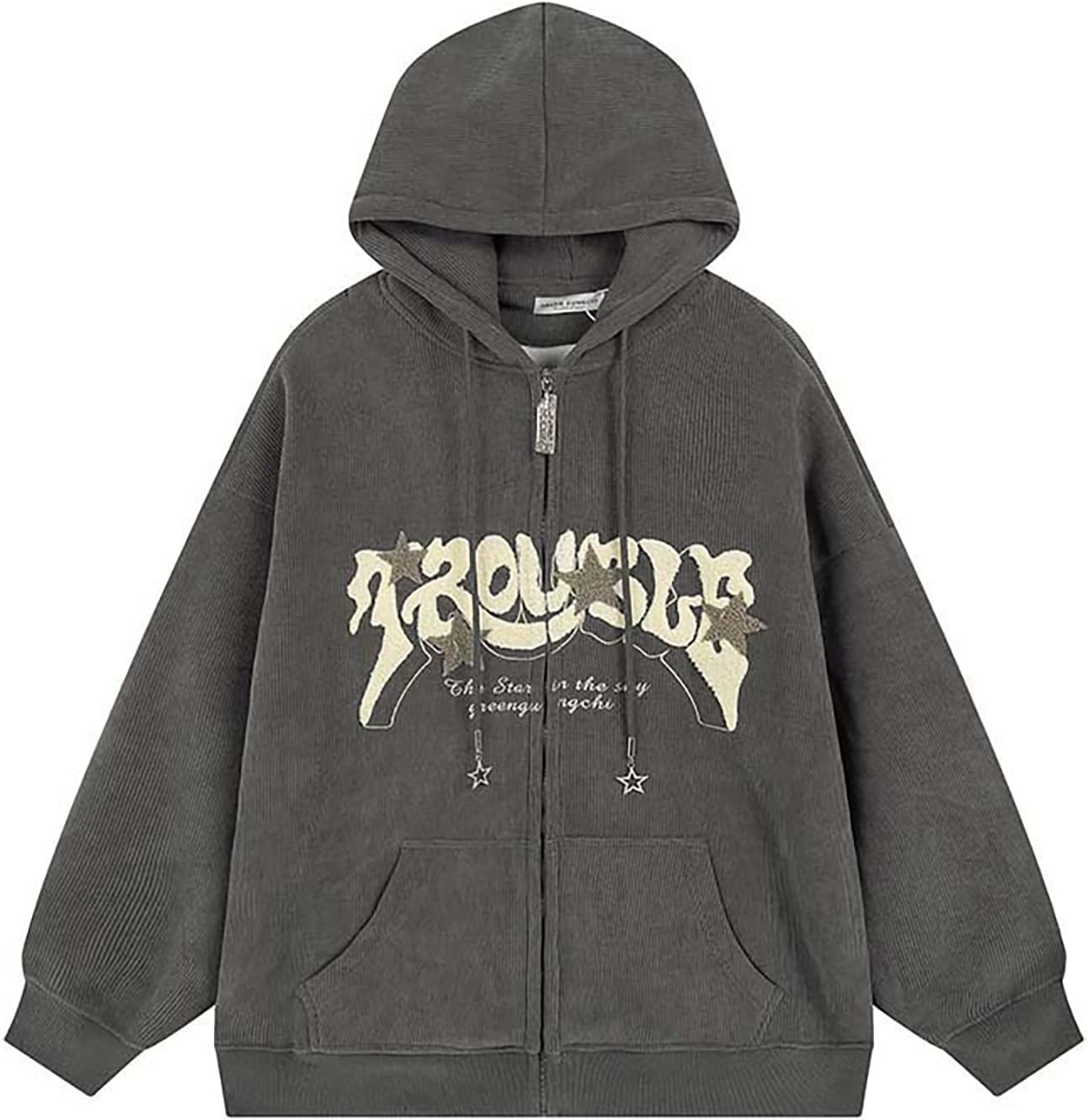 Sumleno Y2K Zip Up Hoodie Letter Print Star Graphic Grunge Hooded Corduroy Sweatshirt Jacket Oversized Retro Y2k Clothing