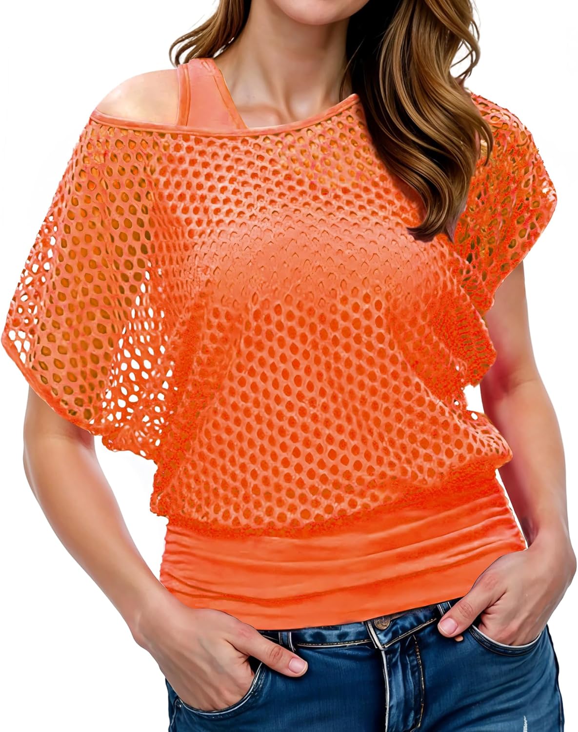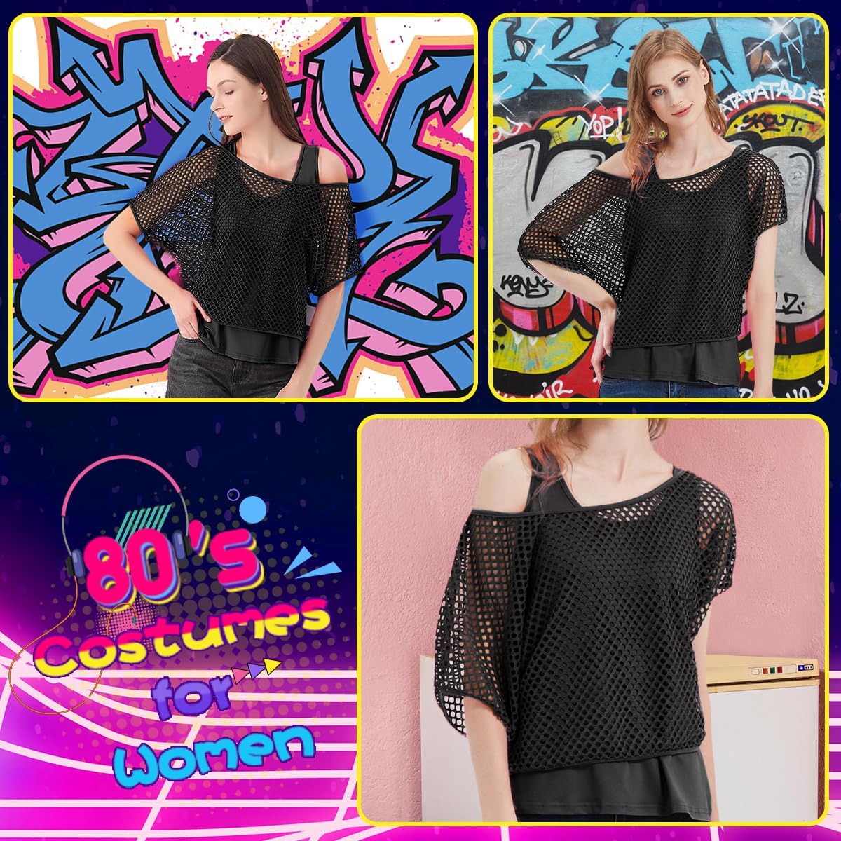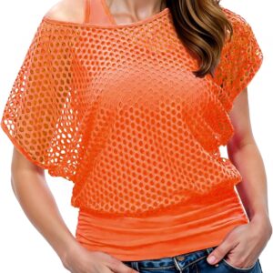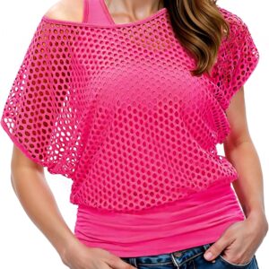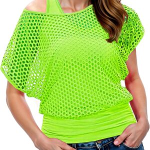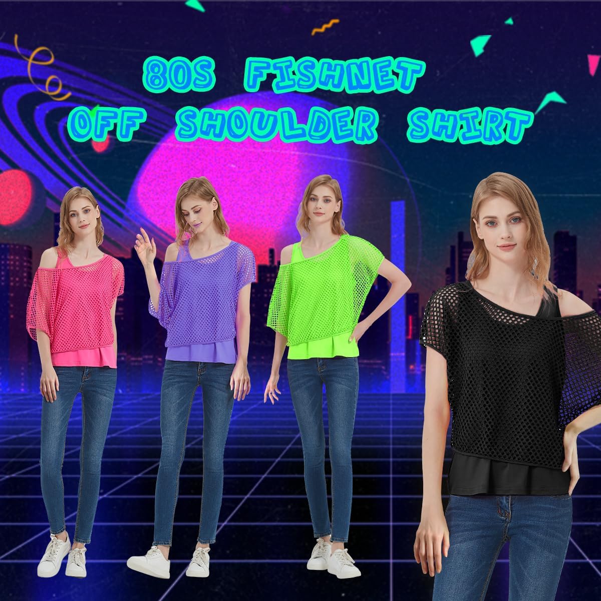 WILDPARTY Women Casual Sexy 80s Costumes Fishnet Neon Off Shoulder T-Shirt Two Pieces