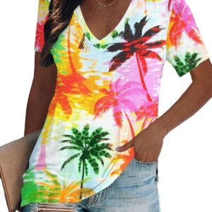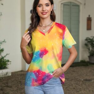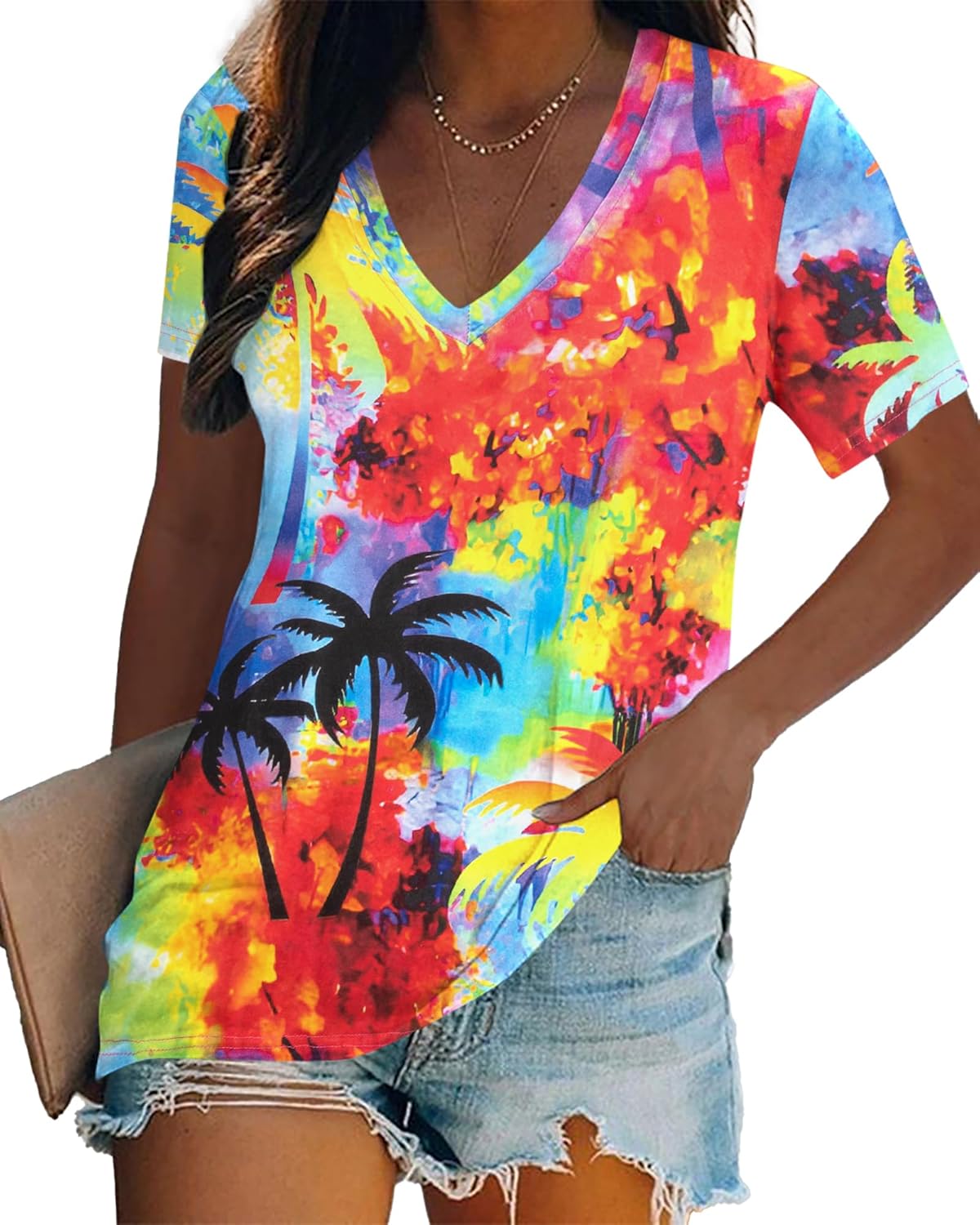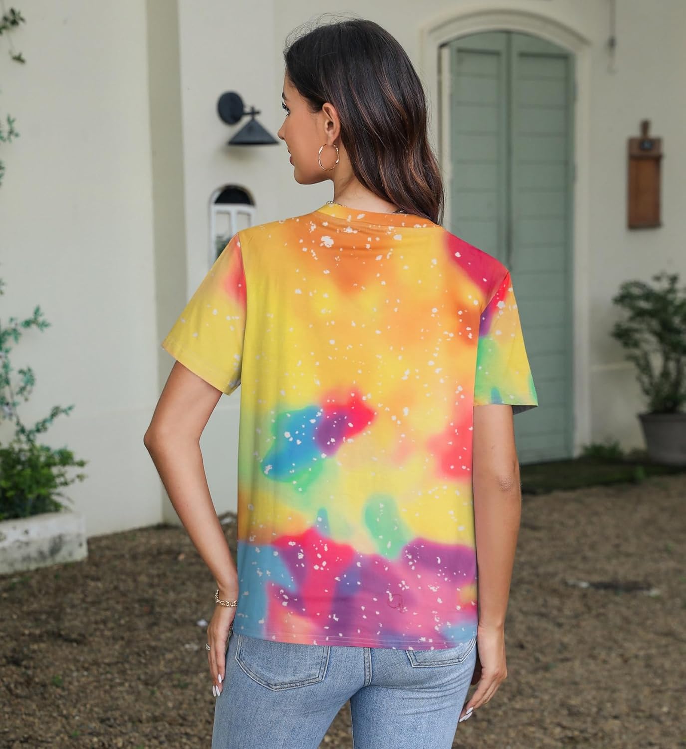 Women Neon Shirts Summer Vintage Tie Dye Tunic Tops Casual Short Sleeve Blouse