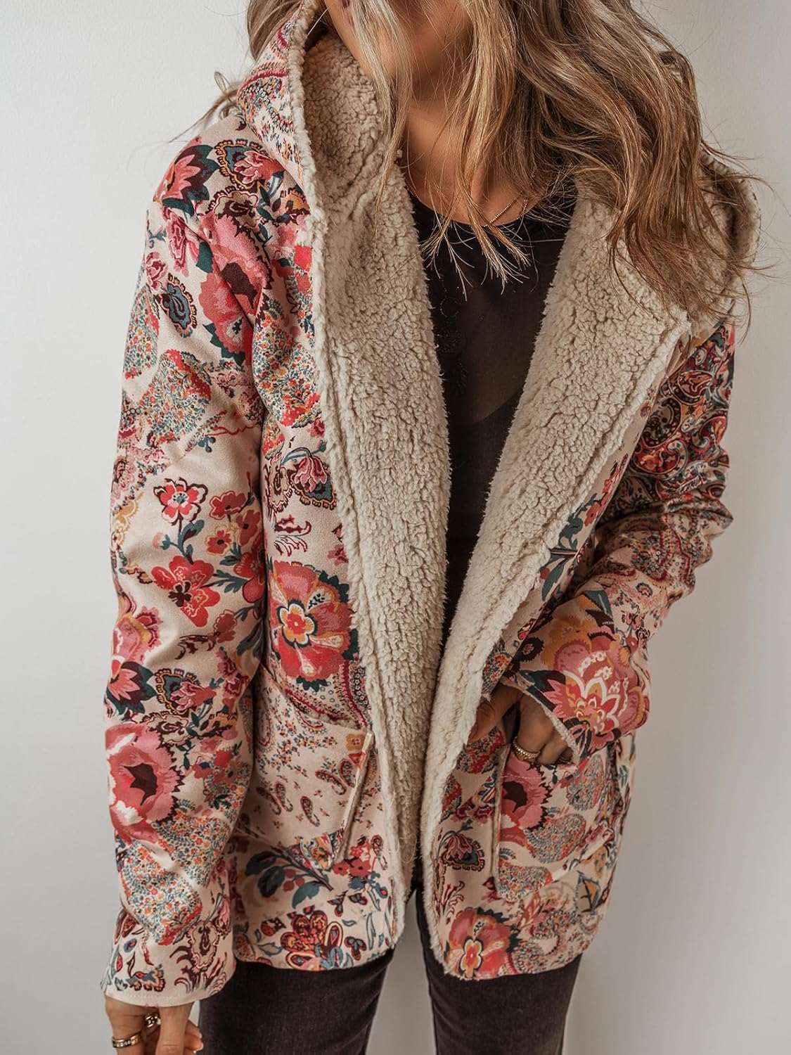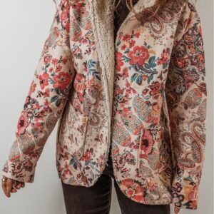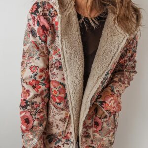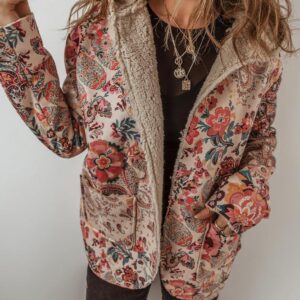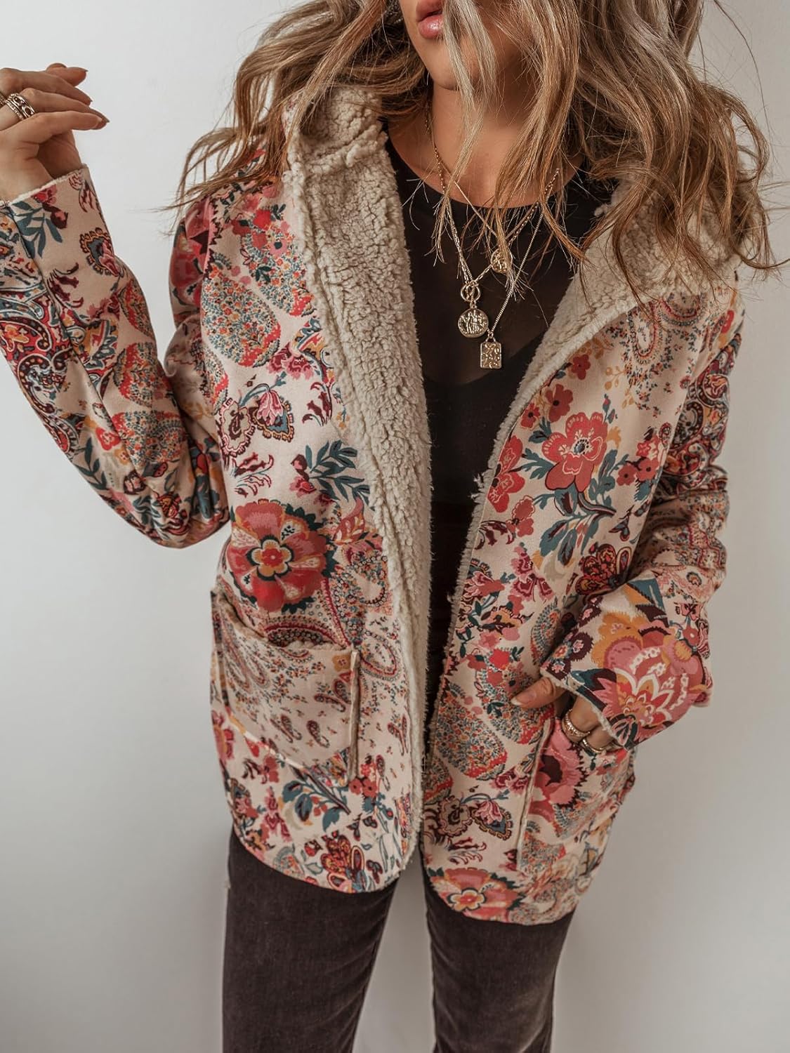 YIGAMA Women’s Winter Plush Hooded Jacket Retro Floral Prints Fleece Lined Open Front Coat with Big Pockets