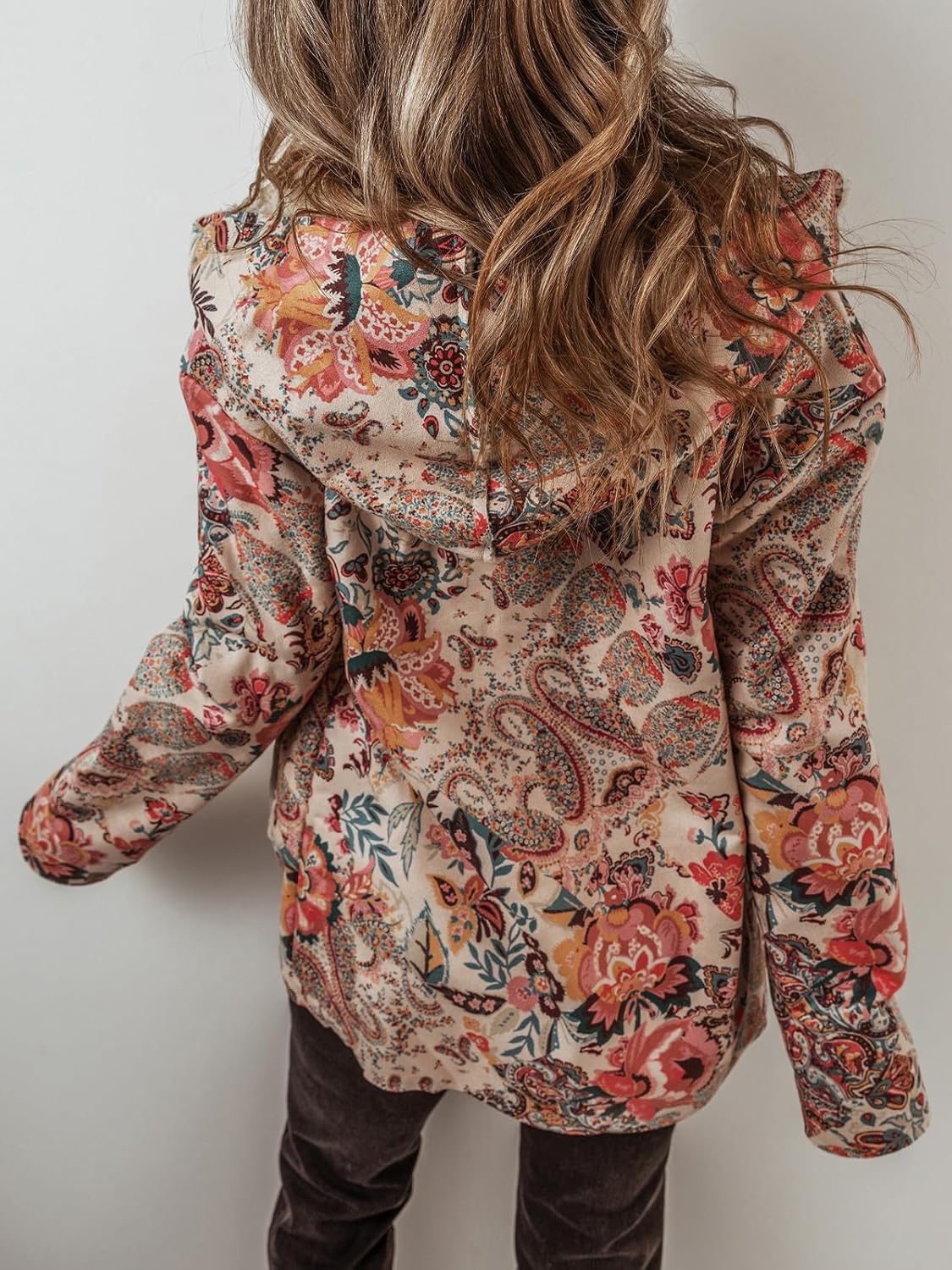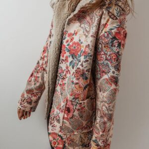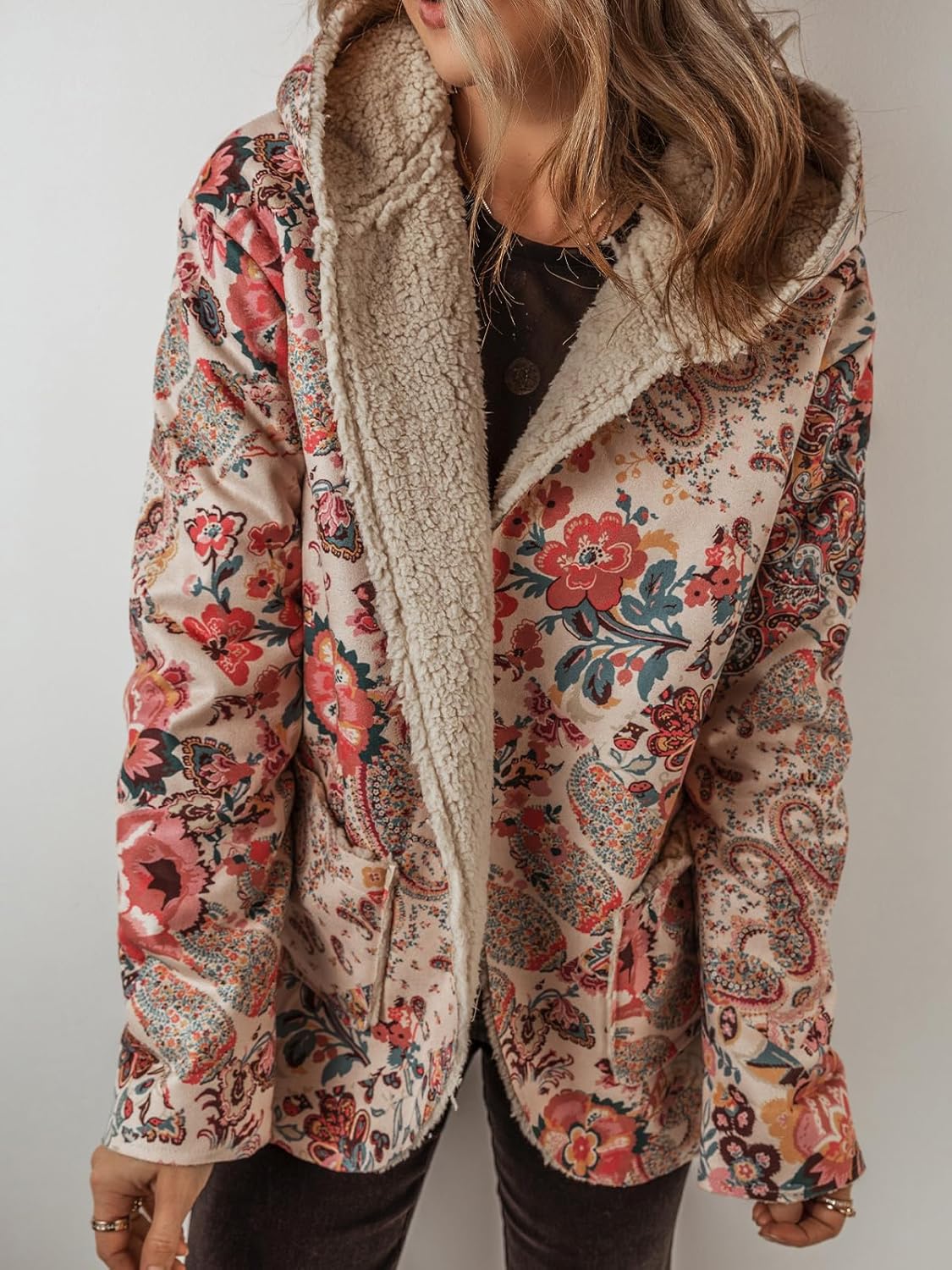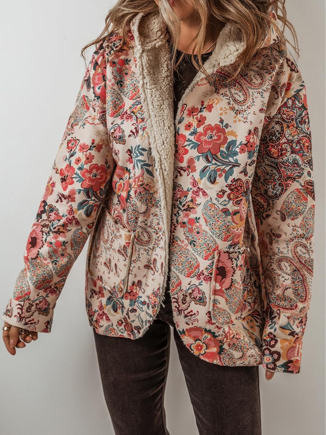 YIGAMA Women’s Winter Plush Hooded Jacket Retro Floral Prints Fleece Lined Open Front Coat with Big Pockets