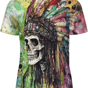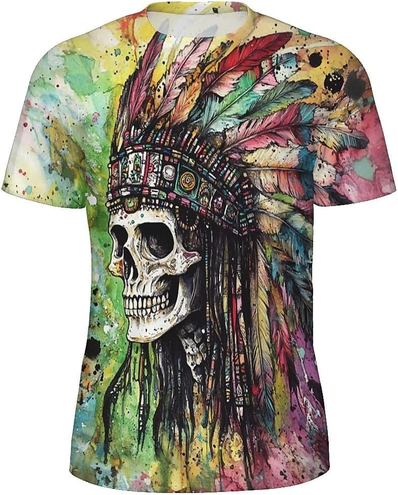 Zhhoya Watercolor Indian Headdress Skull Paint T-Shirts for Men Boys Crew Neck 3D Printed Graphic Short Sleeve Tees Shirt